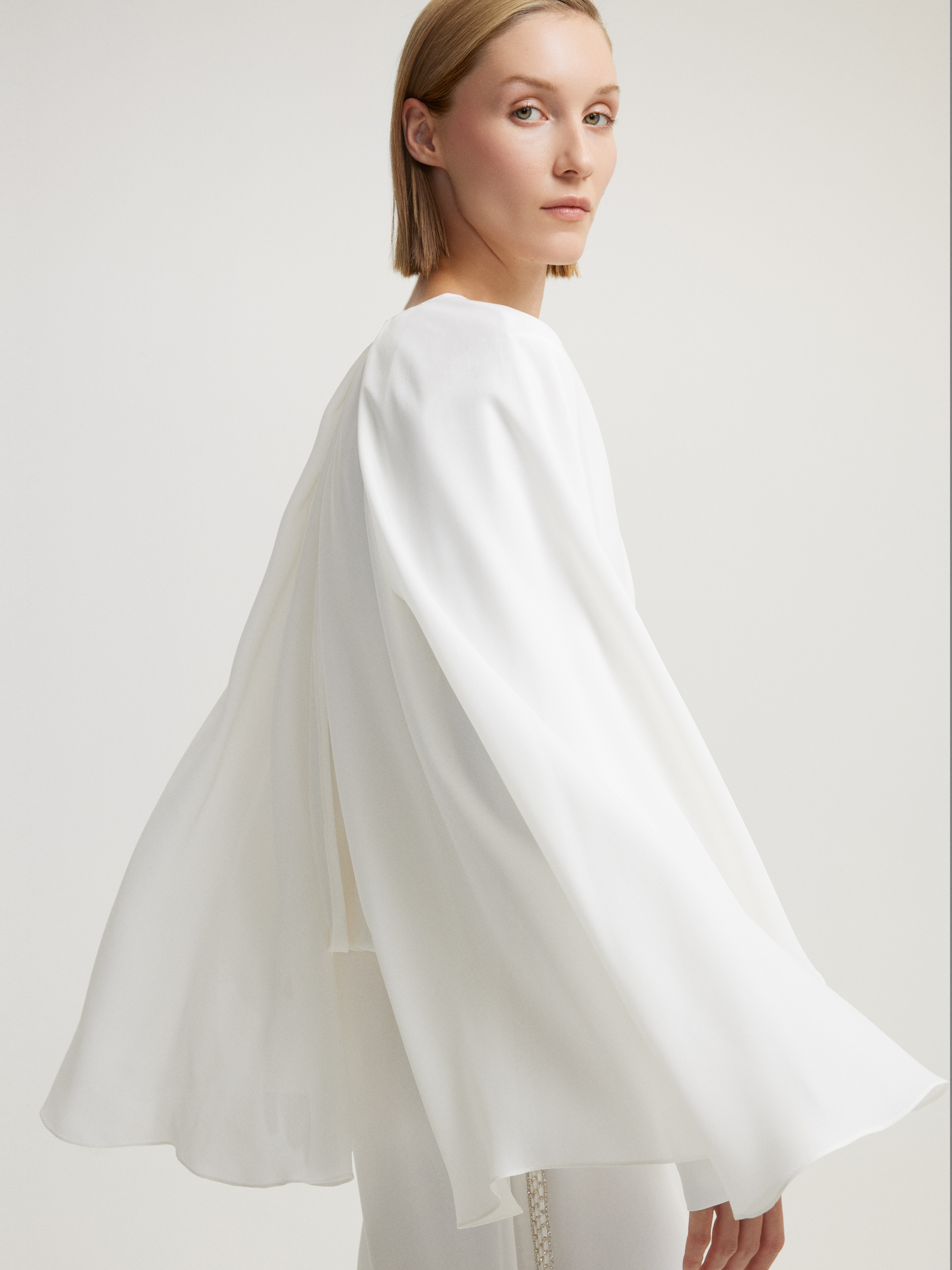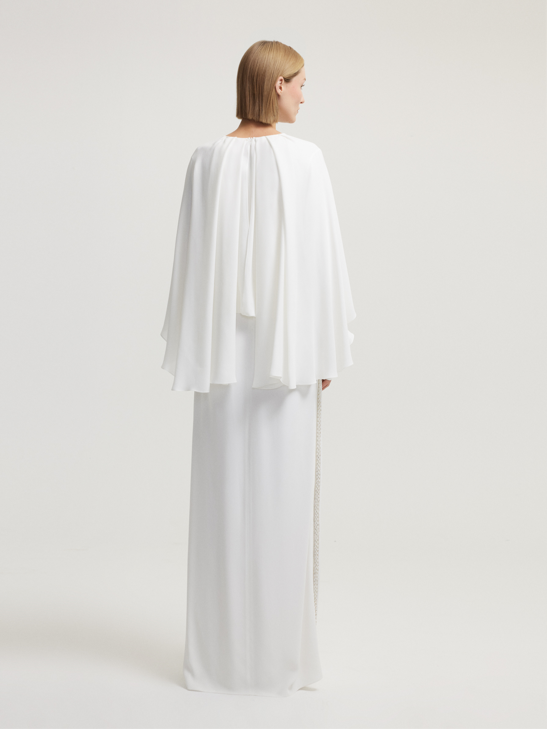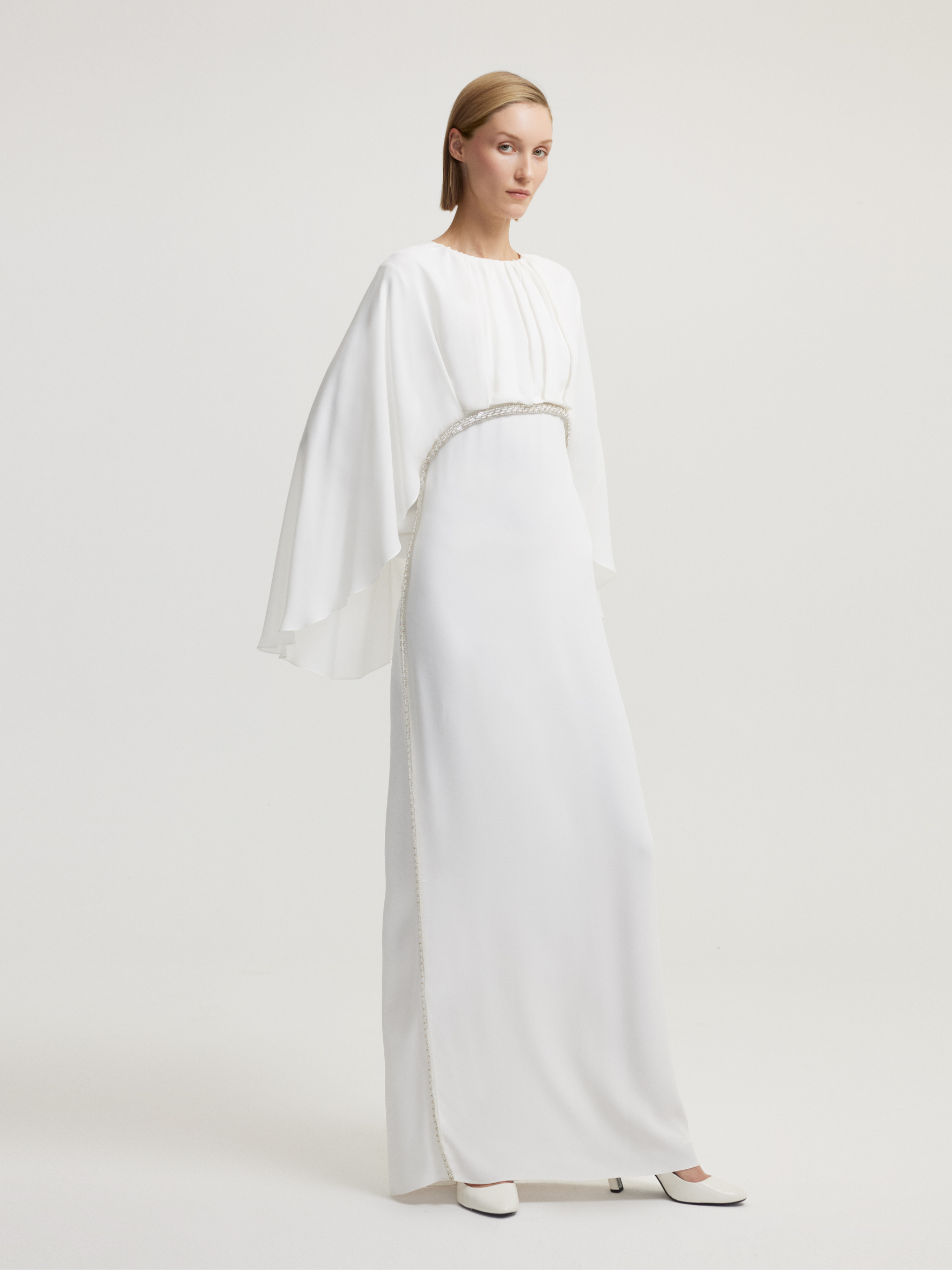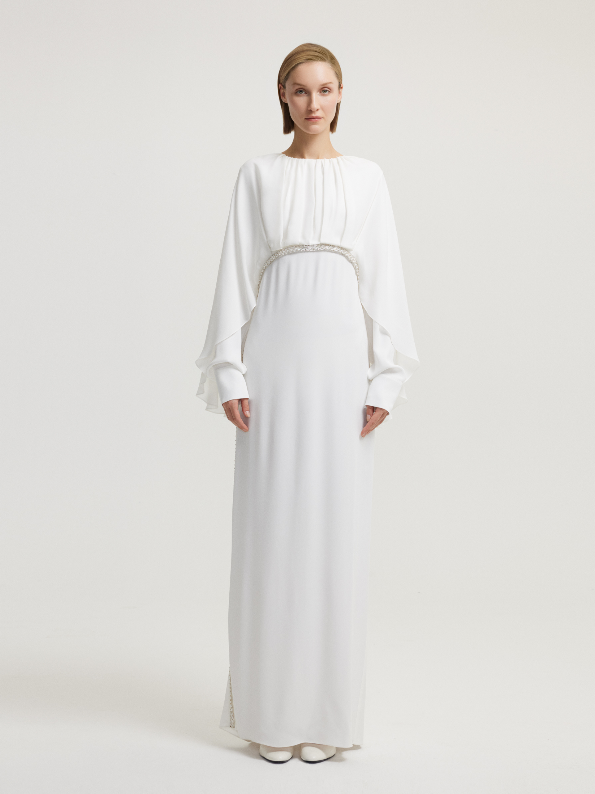 فستان أبيض مزين بالخرز وحزام