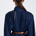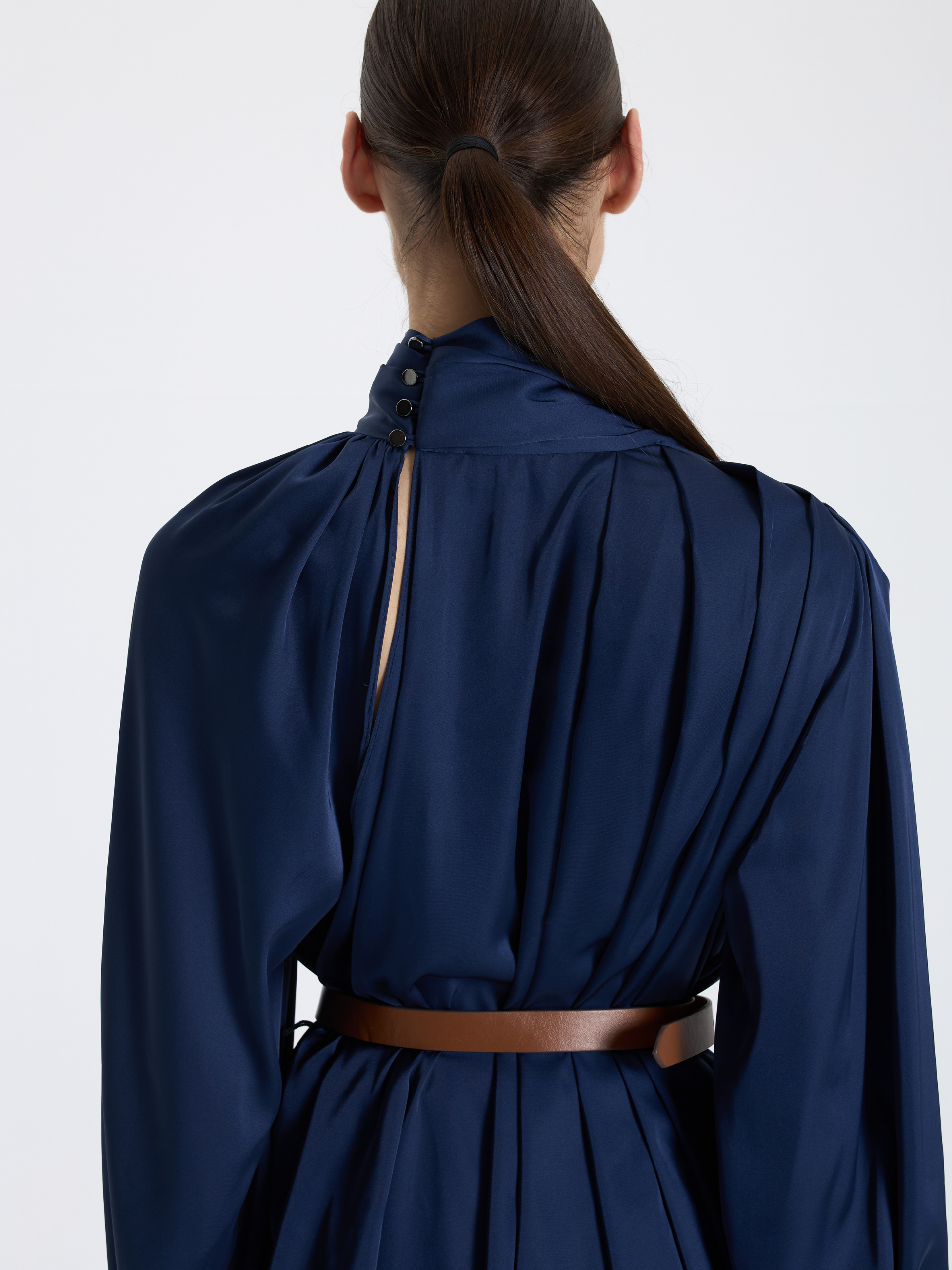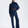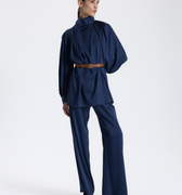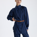 This BAQA blouse in blue with a draped neckline offers an elegant and eye-catching design.