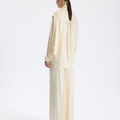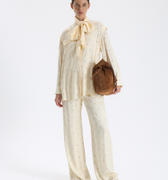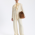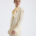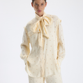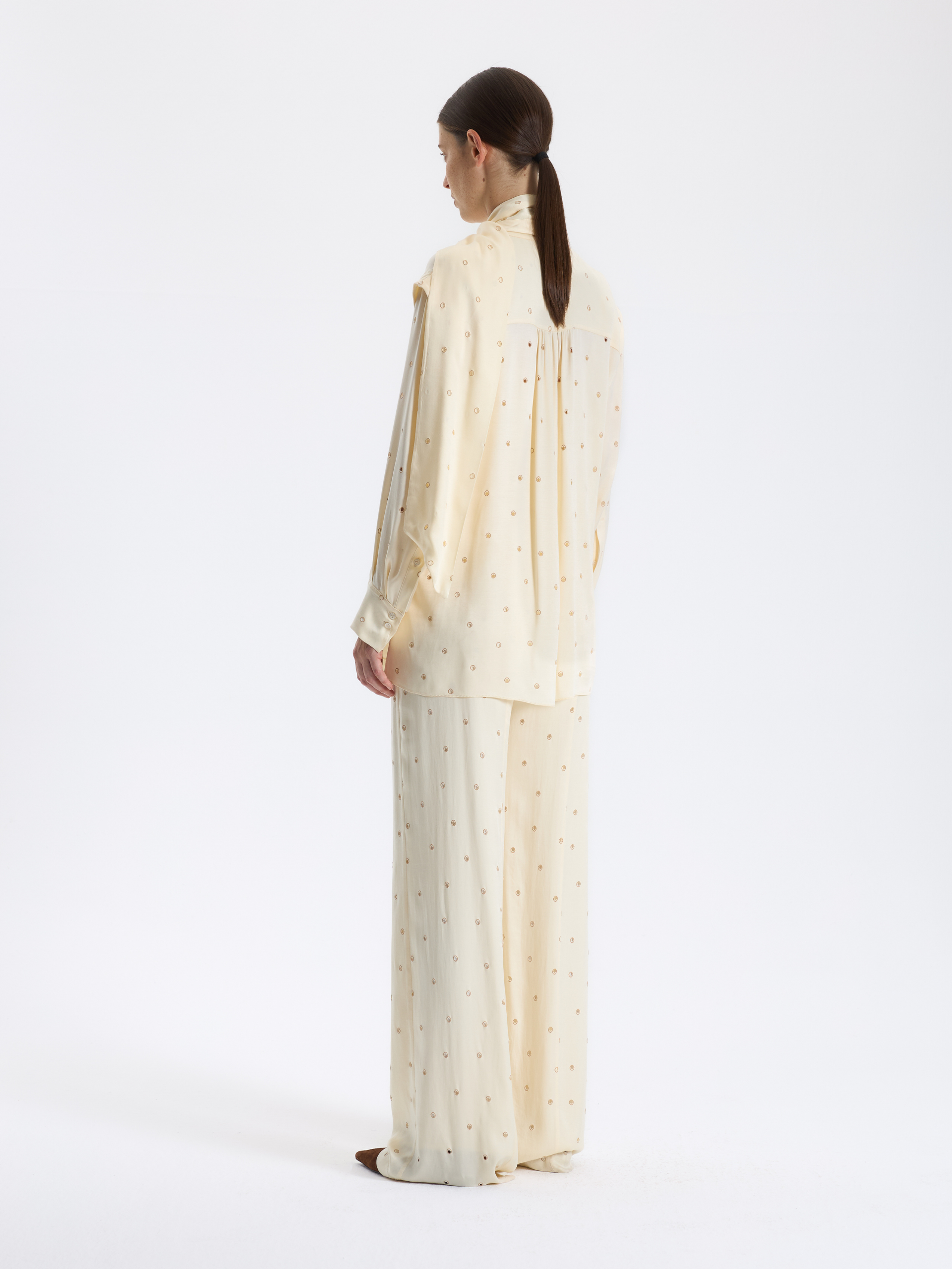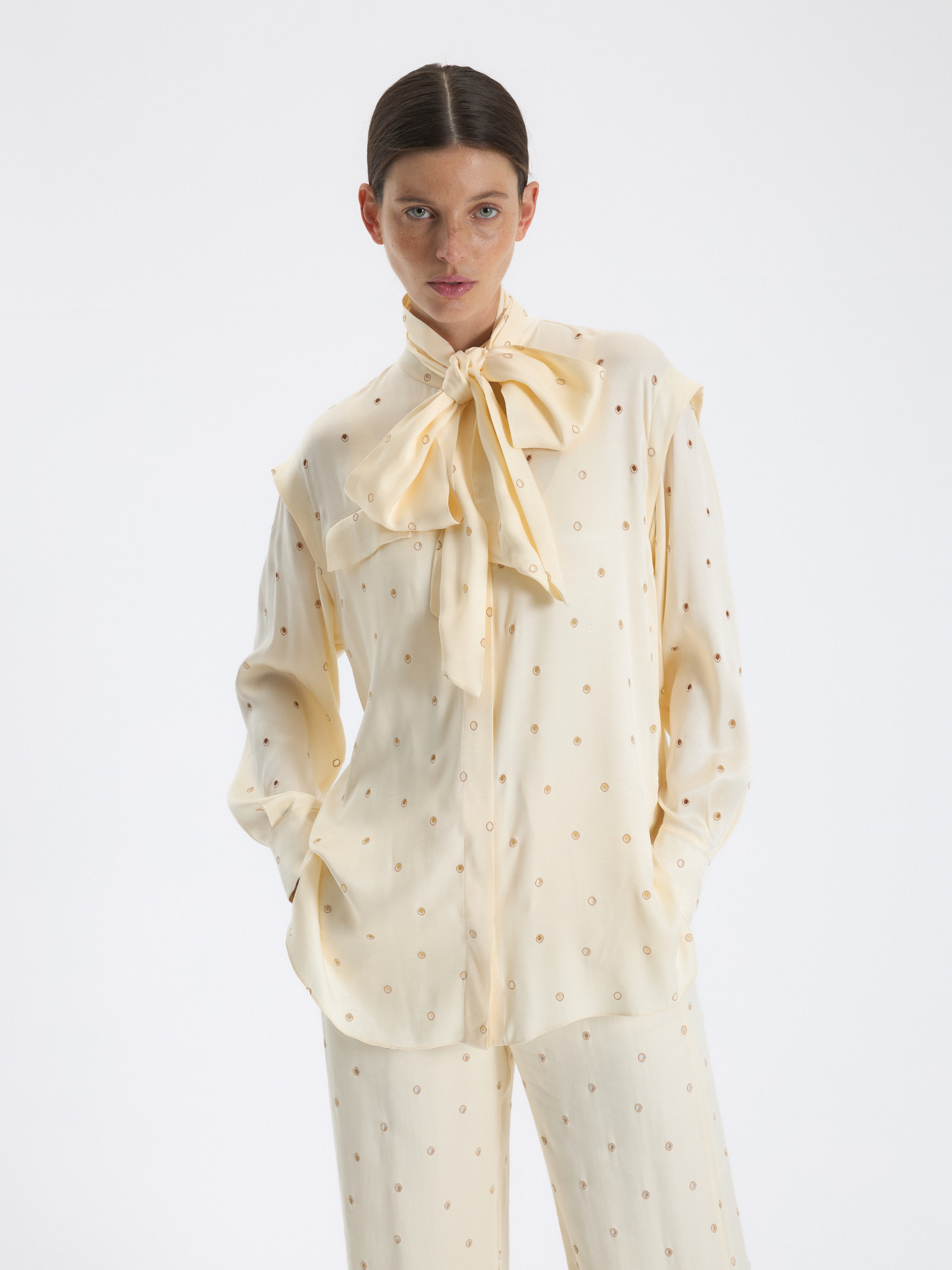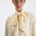 Cream blouse with subtle polka dots and scarf detail for an elegant feminine touch.