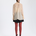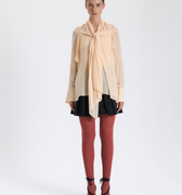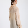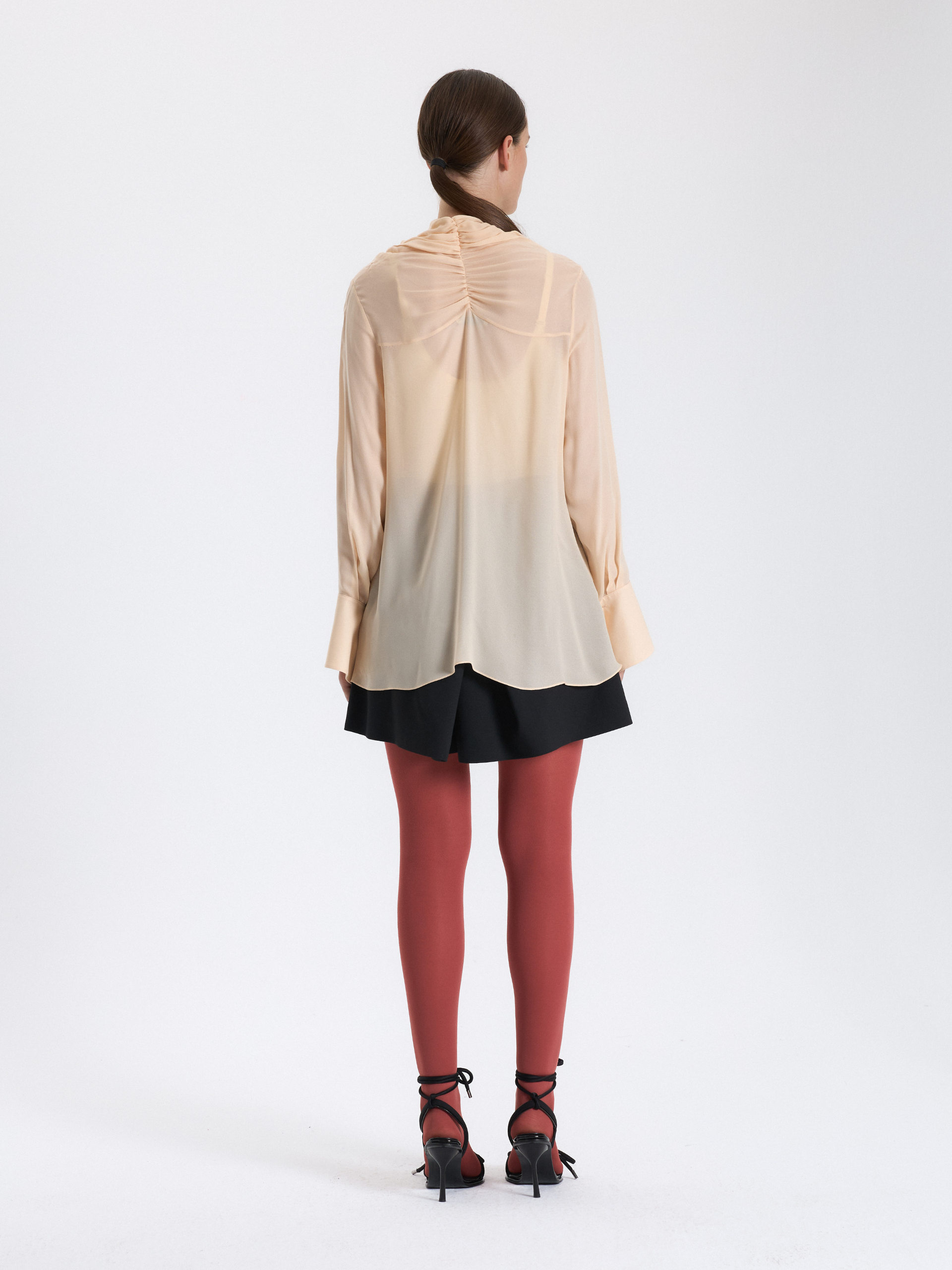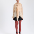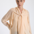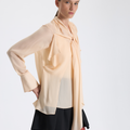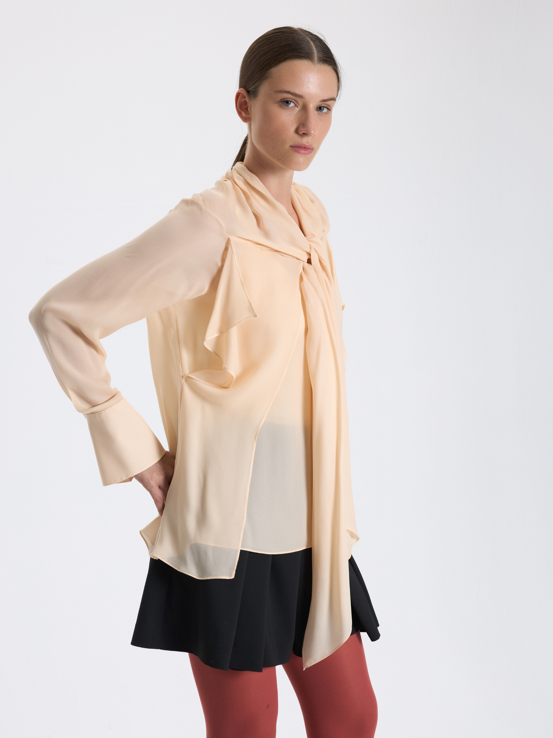 Feminine cream blouse with a draped design and tie detail for effortless elegance.