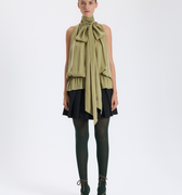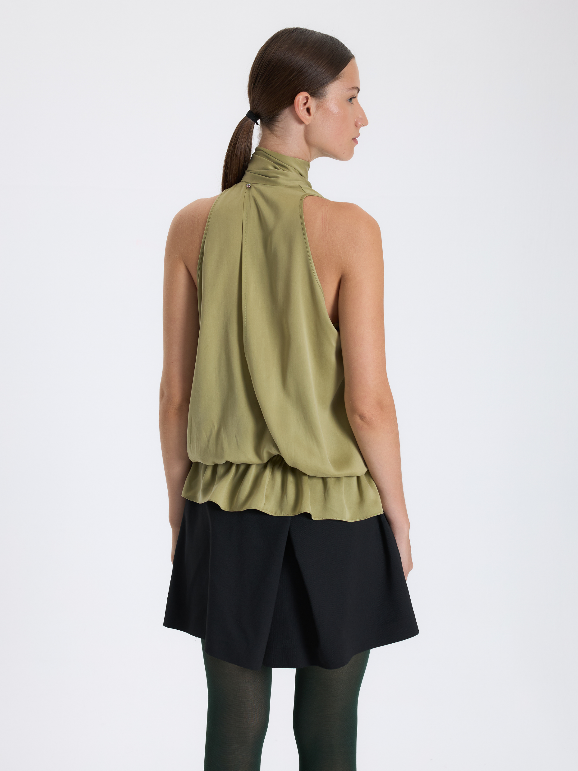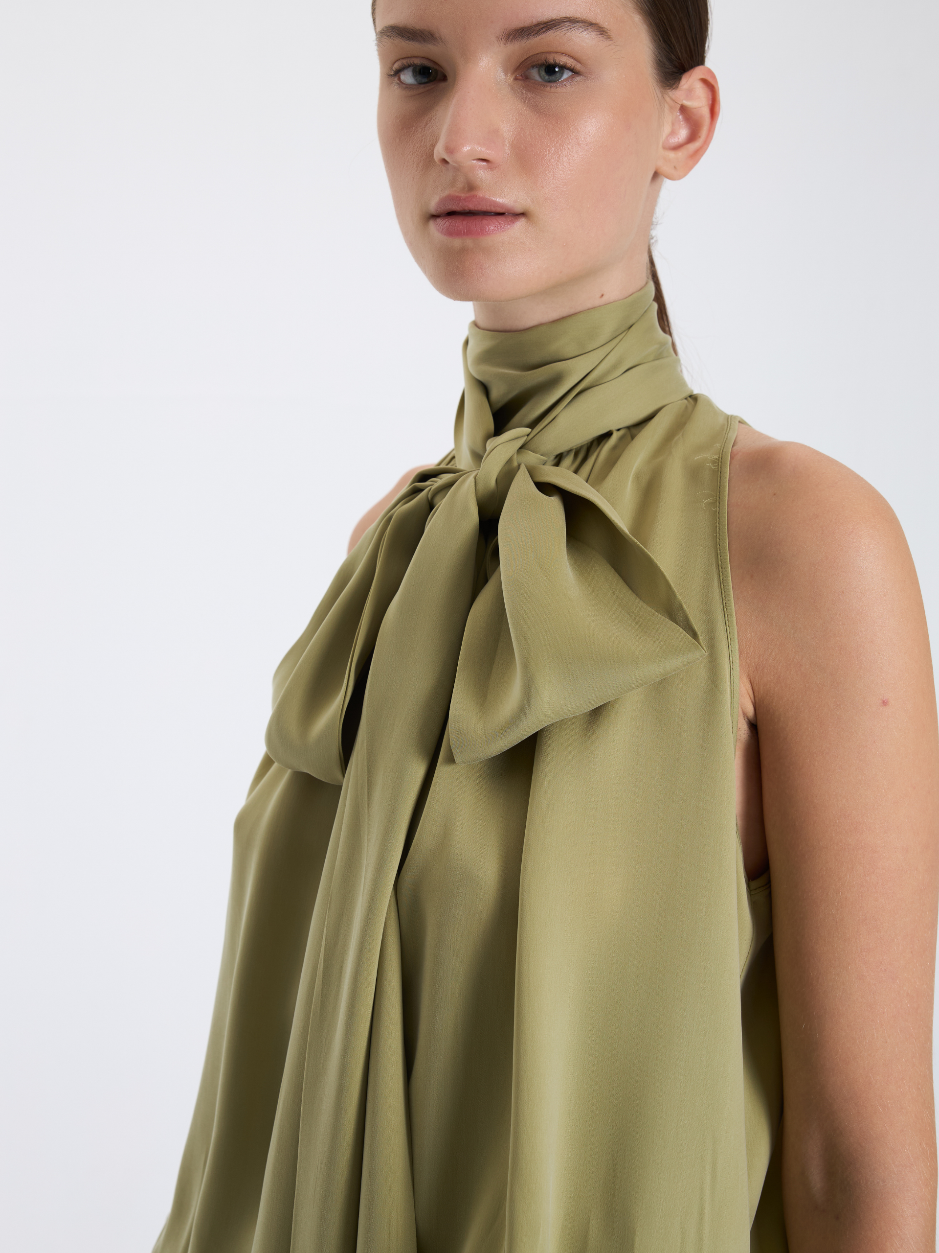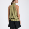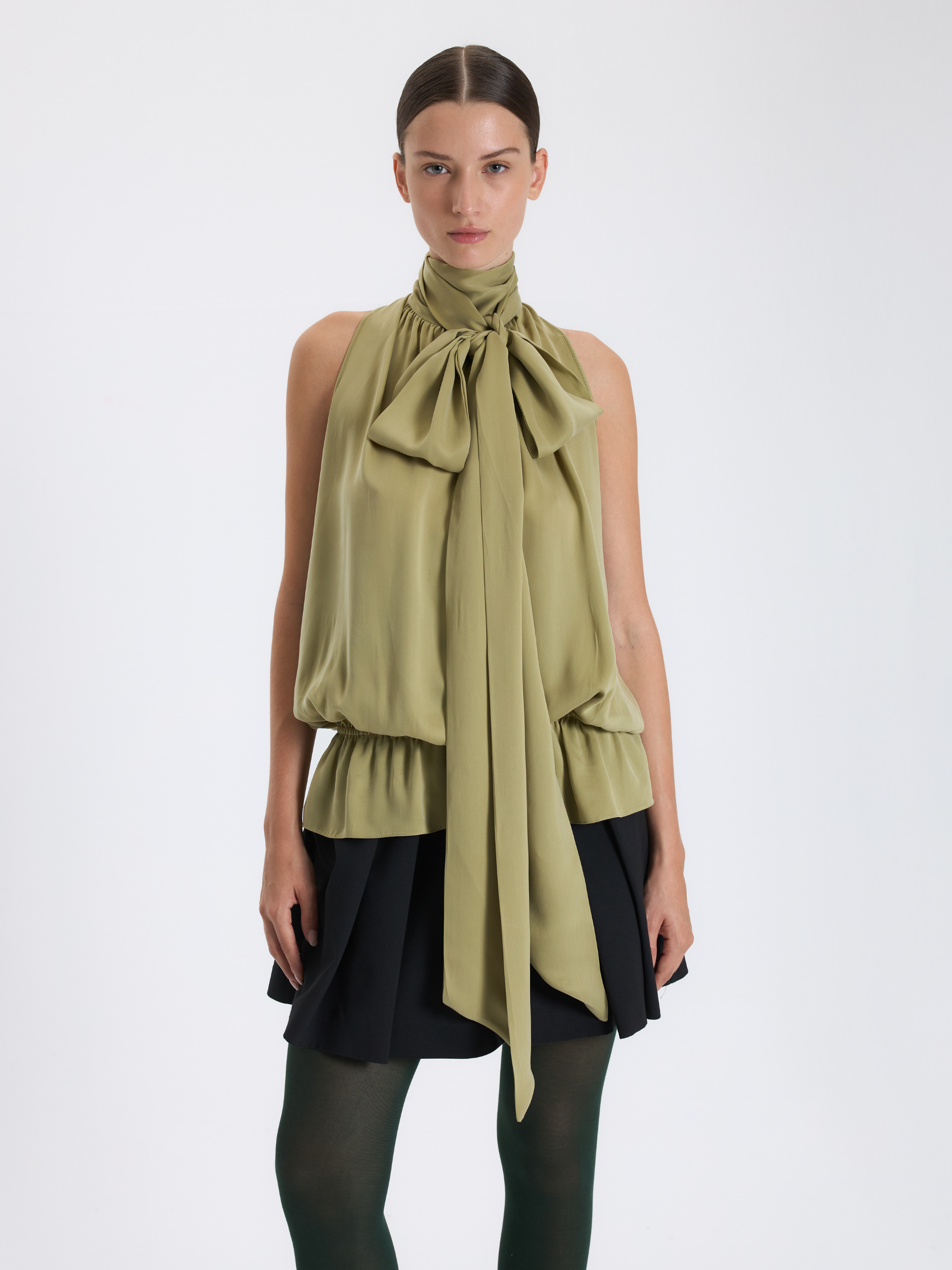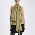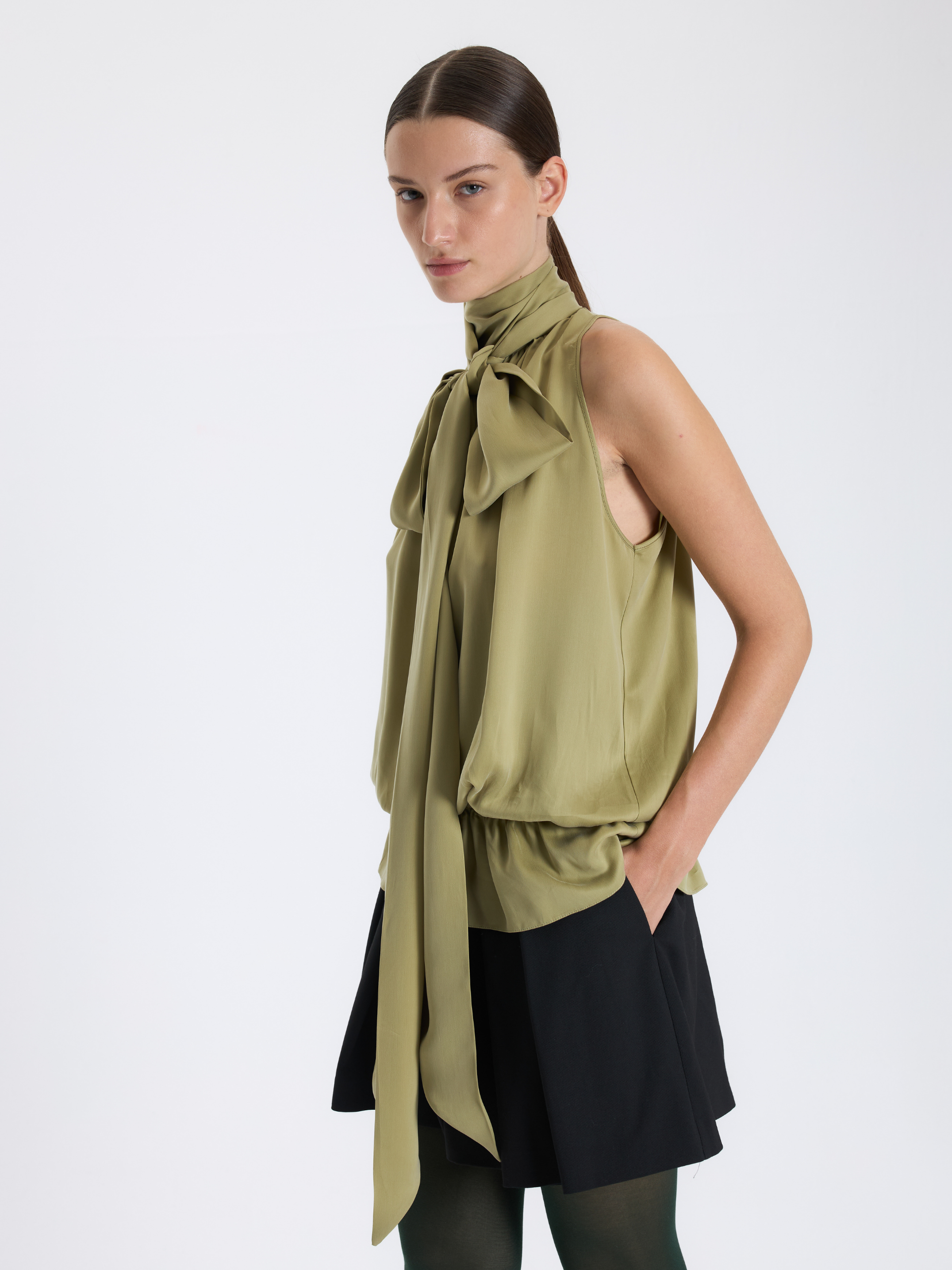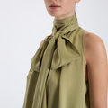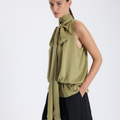Premium kumaşla tasarlanmış olan bu fular bağlamalı kolsuz yeşil BAQA bluzu, tüm alt giyim parçalarınızla kombinleyebilirsiniz.