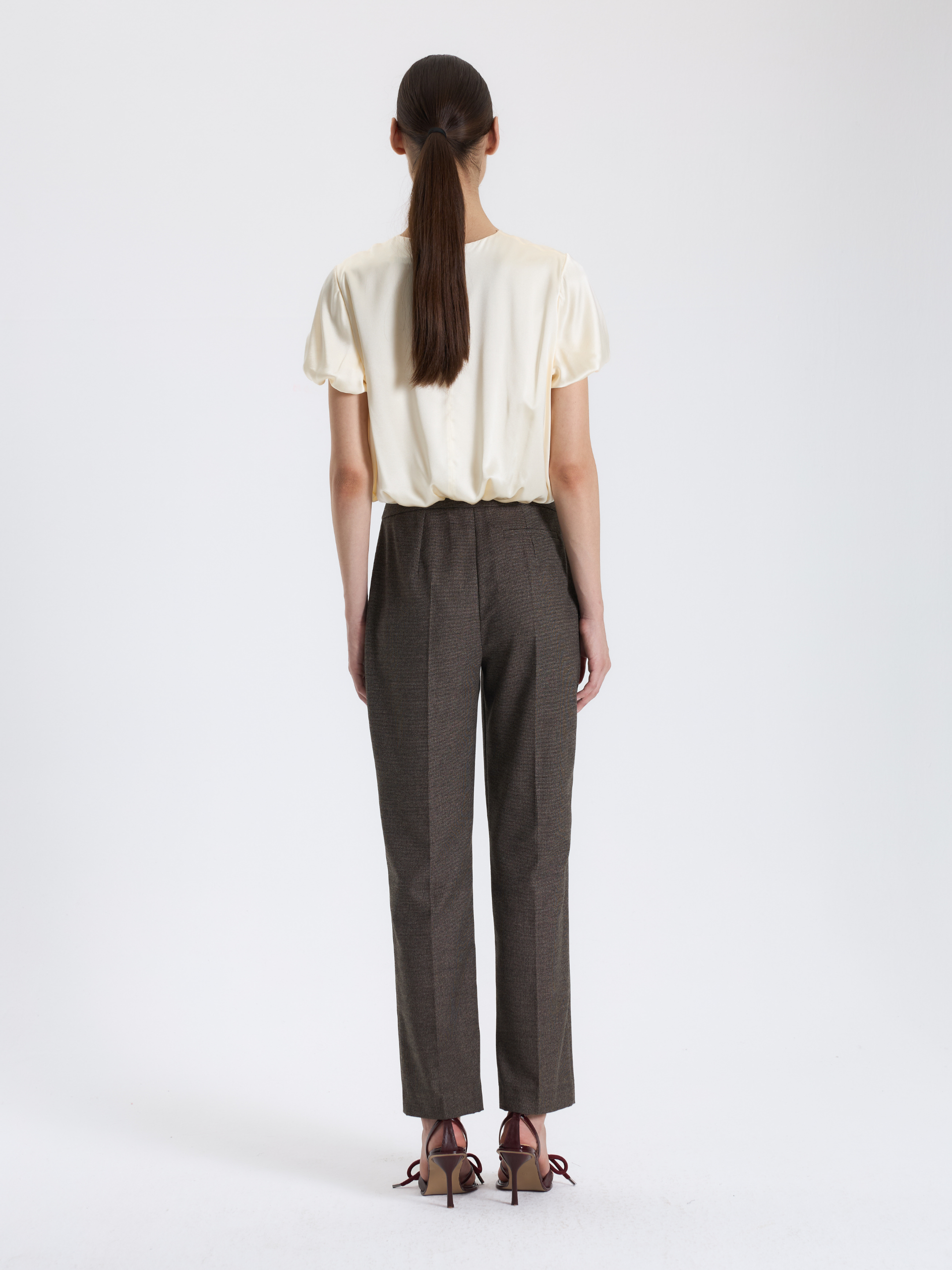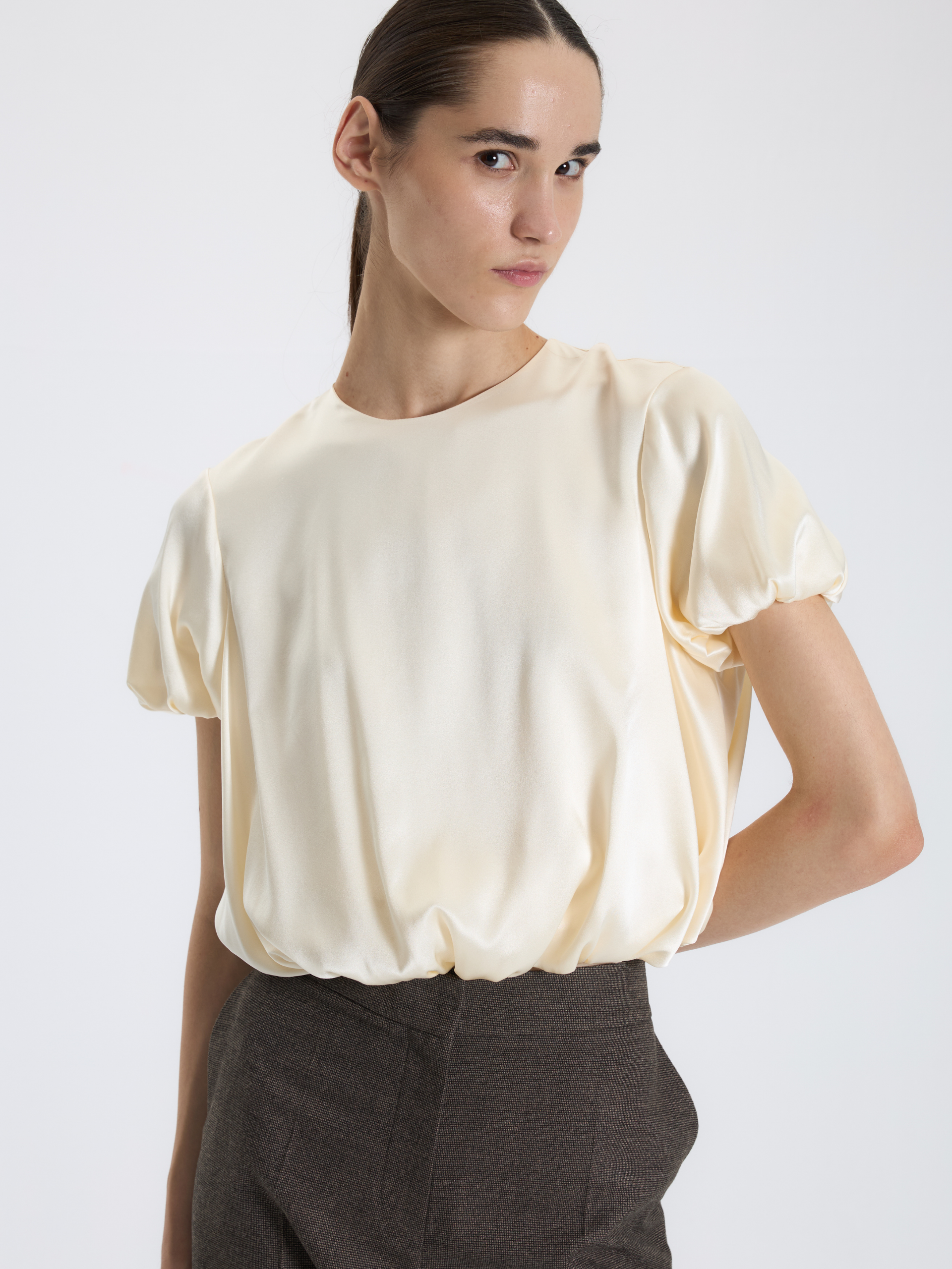 Saten kısa kollu bluz, zarif dokusu ve büzgülü kollarıyla modern şıklık sunar.