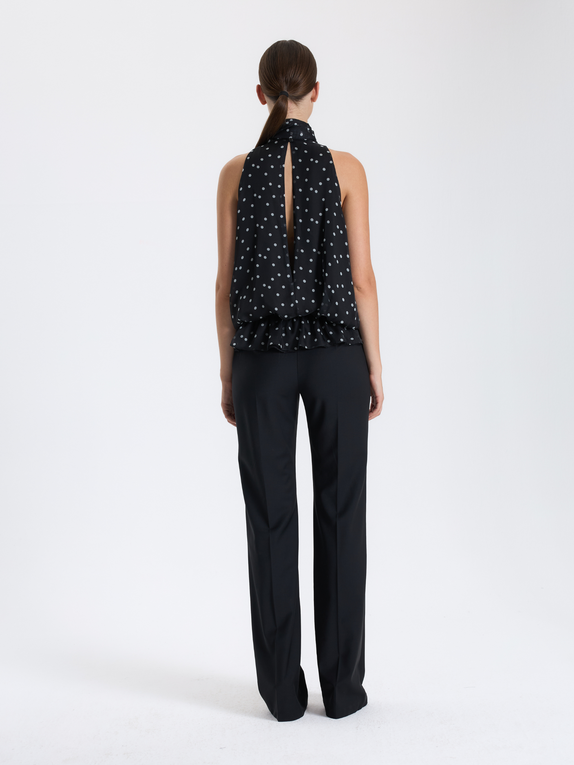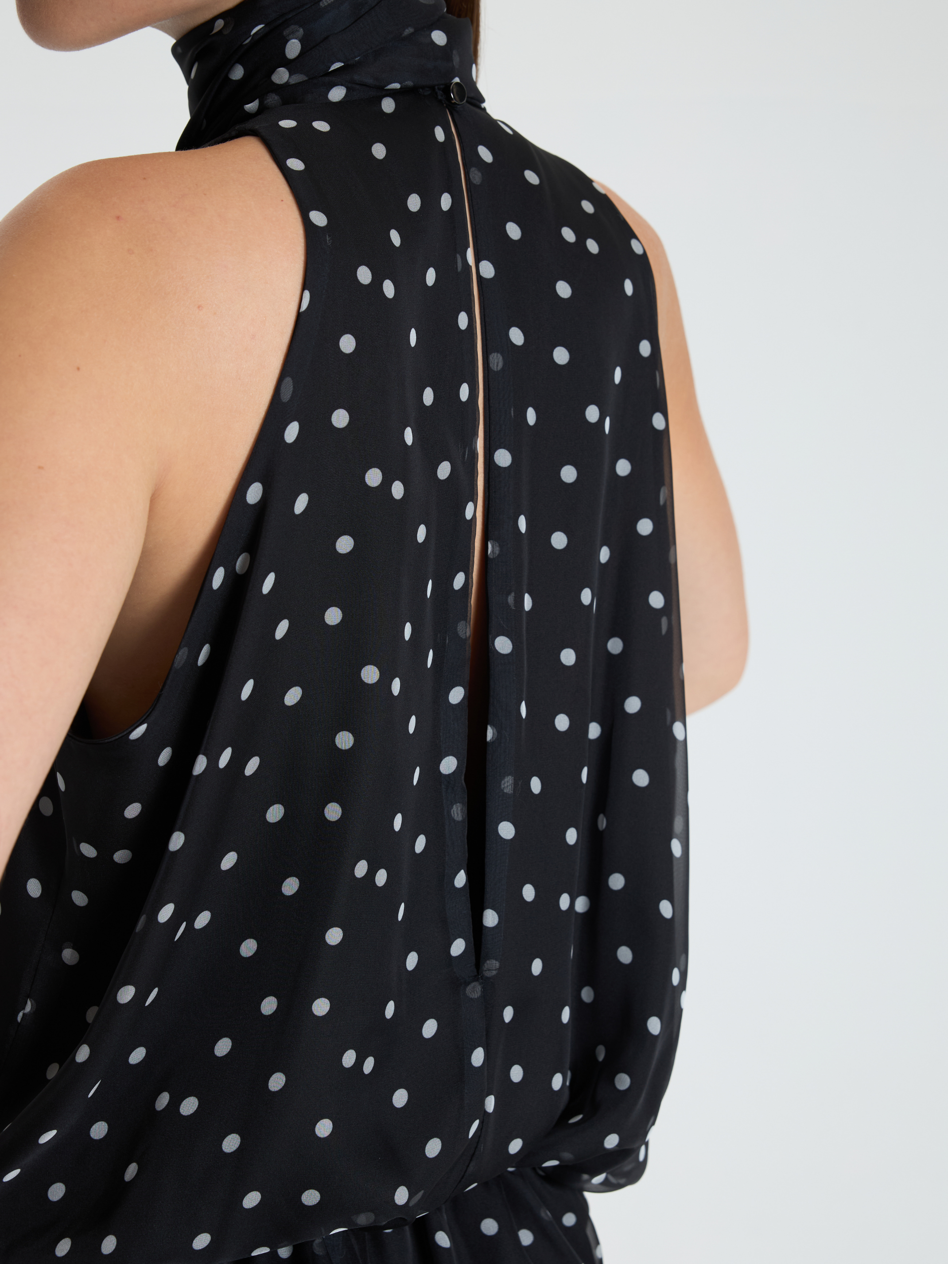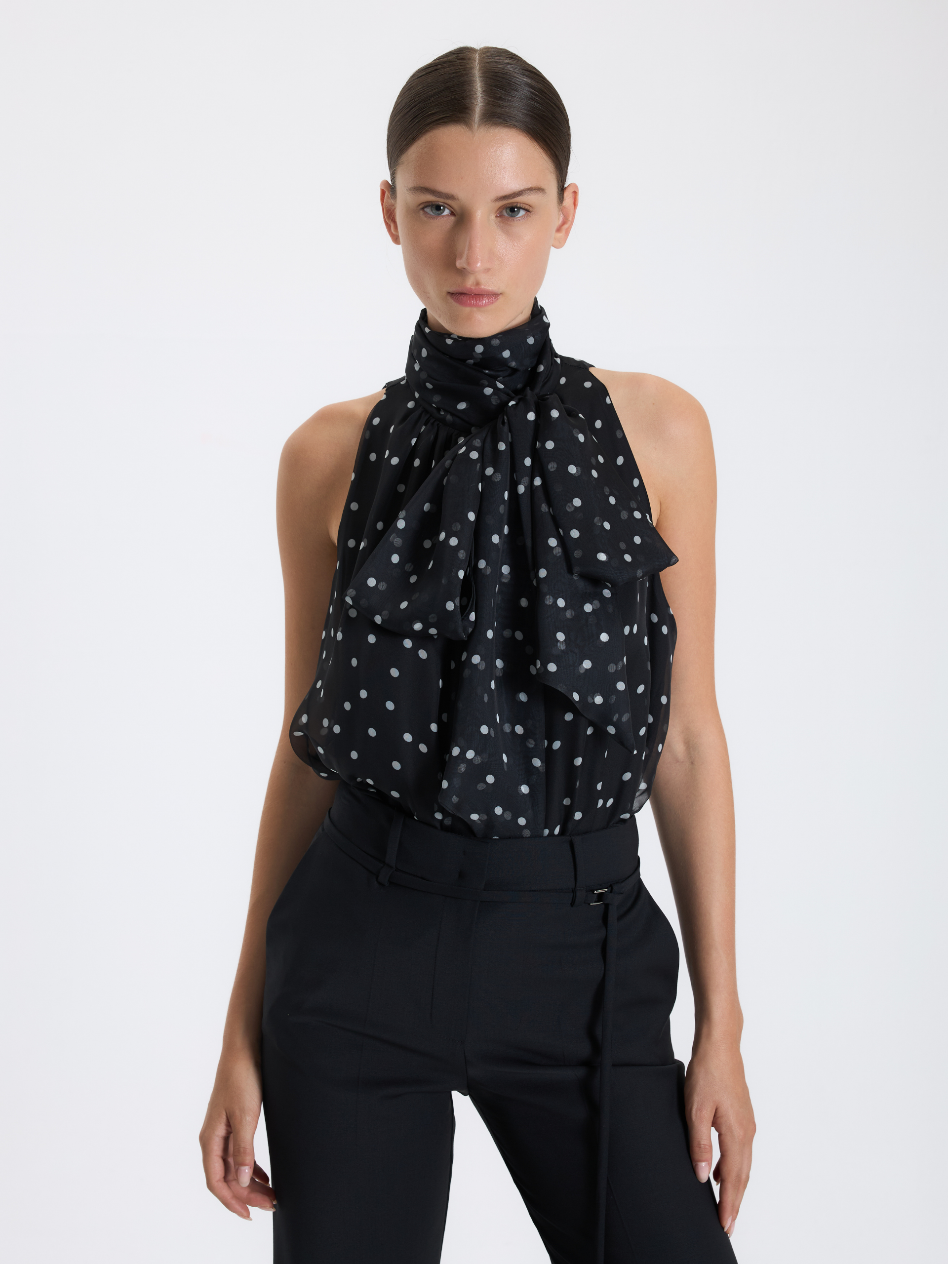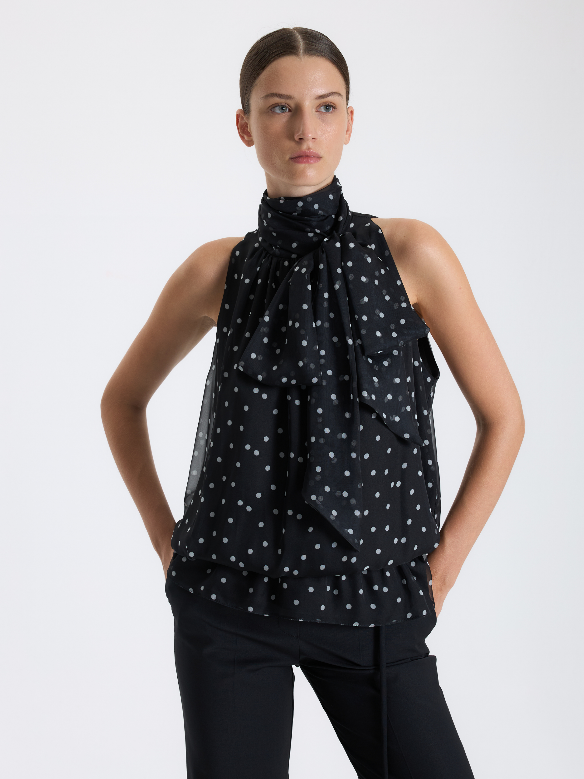 Premium kumaşla tasarlanmış olan bu fular bağlamalı siyah kolsuz BAQA bluzu, tüm alt giyim parçalarınızla kombinleyebilirsiniz.