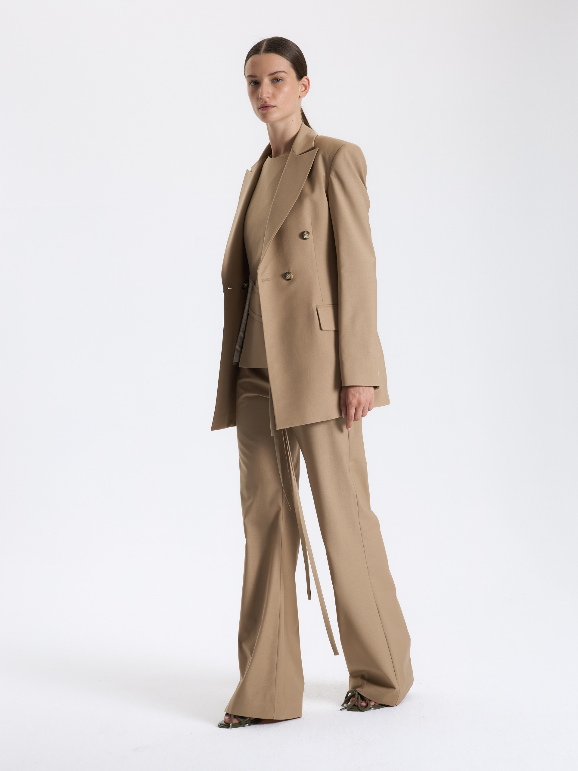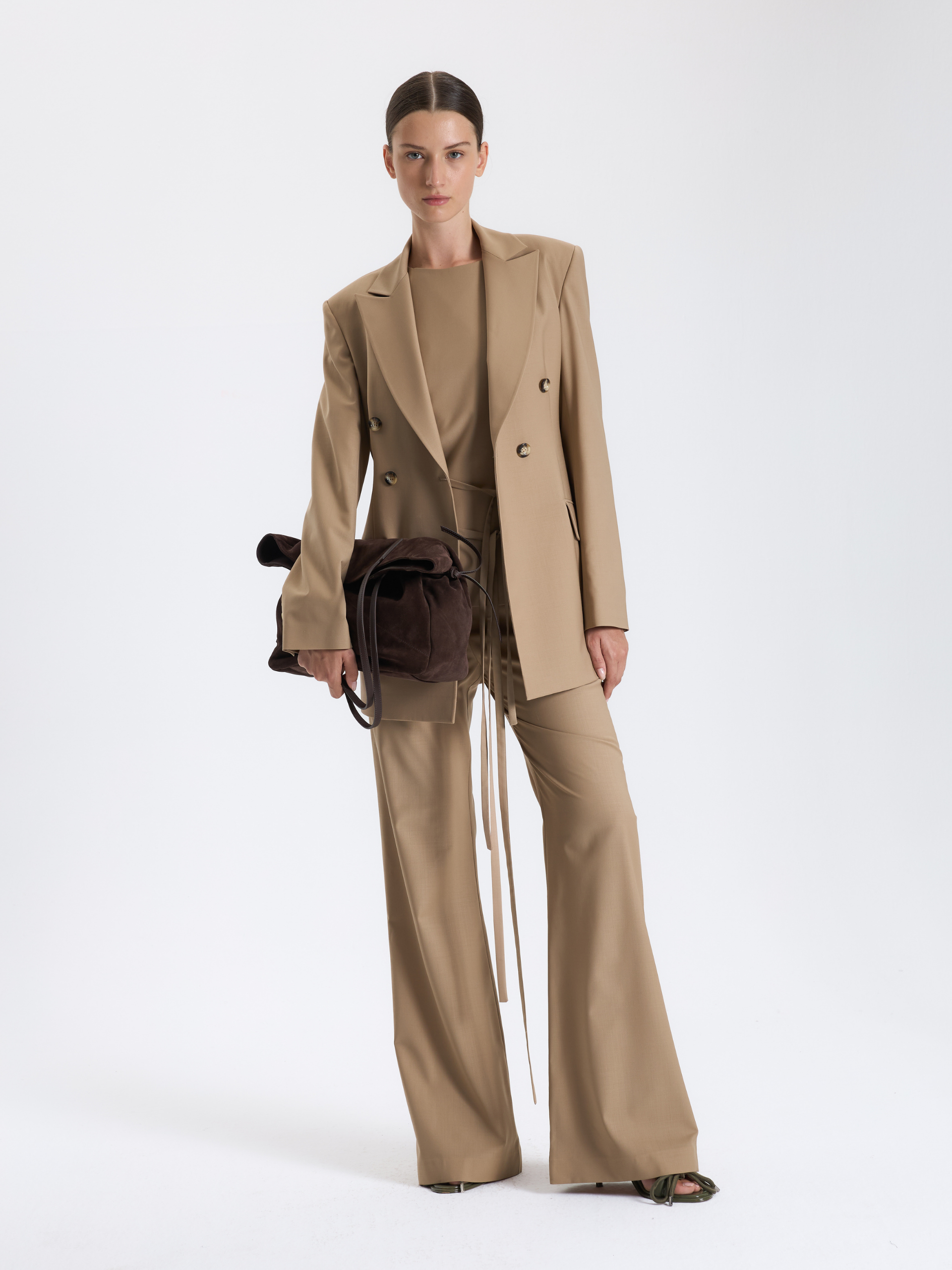Kruvaze kesimiyle güçlü bir siluet oluşturan bu karamel tonlu blazer ceket, net hatları sayesinde tek başına bile stilin merkezinde yer alır. Nötr renk paleti, ofis stilinden şehir kombinlerine kadar farklı parçalara kolayca uyum sağlar.