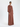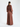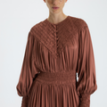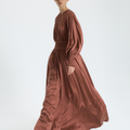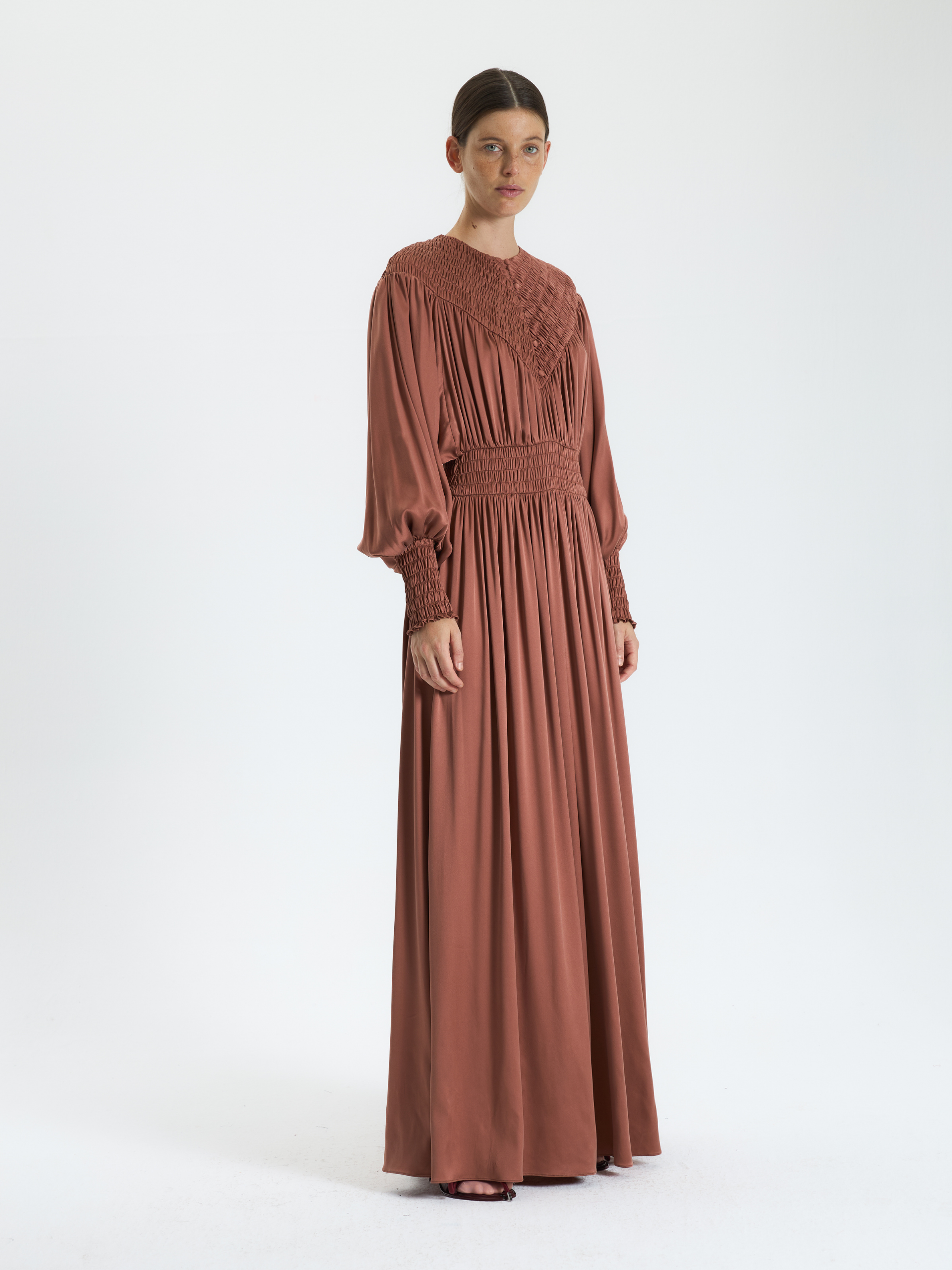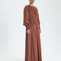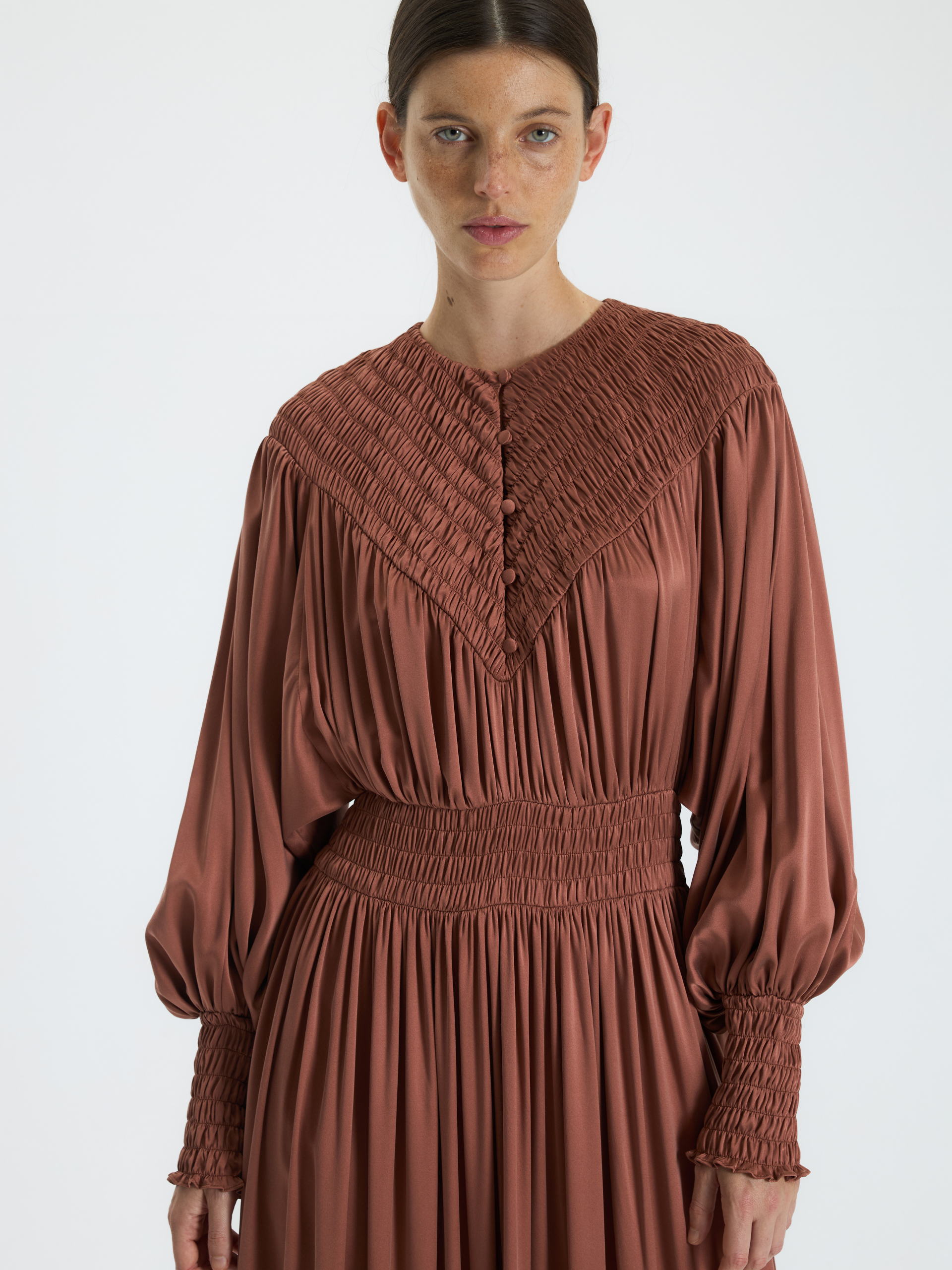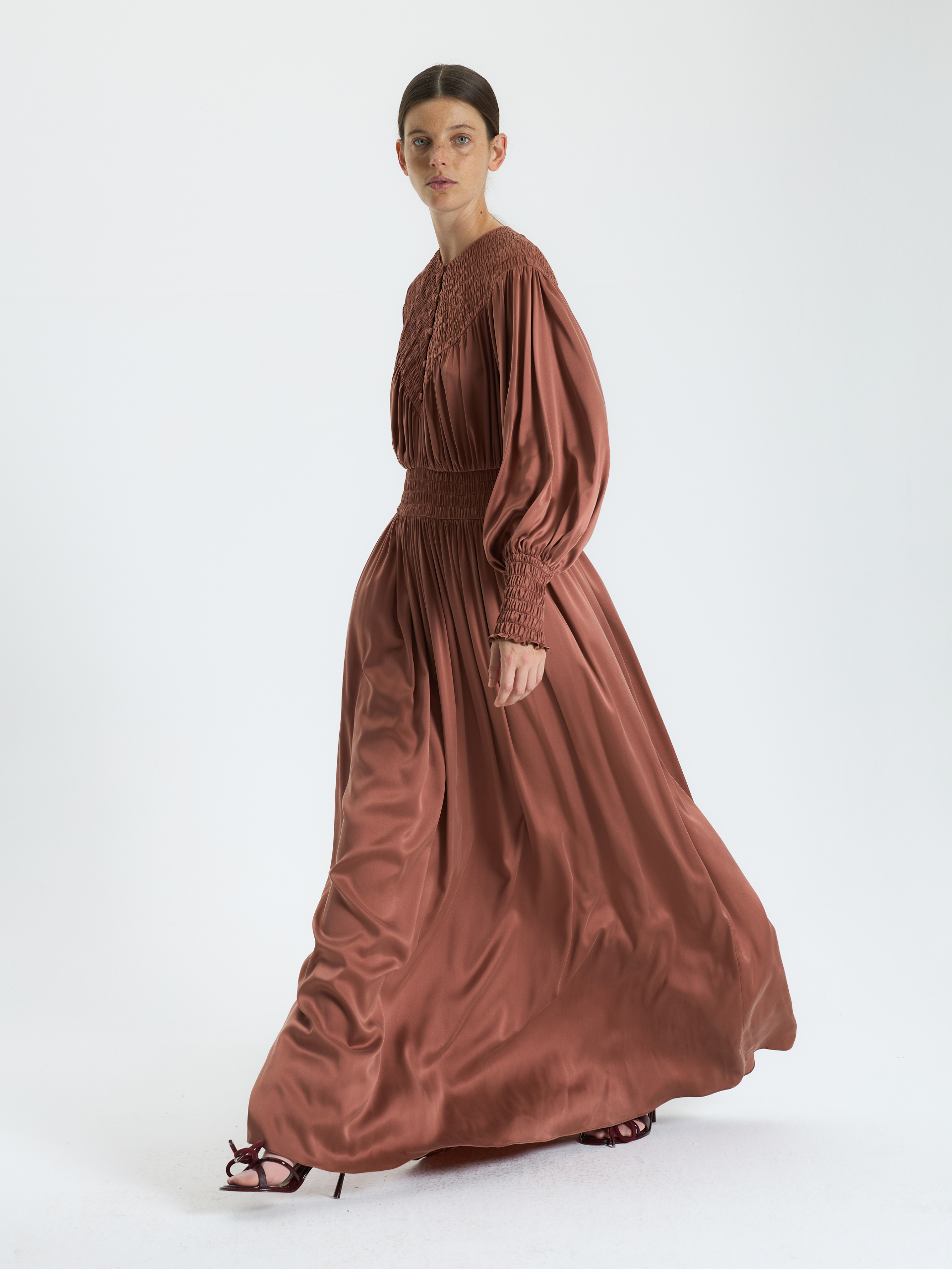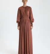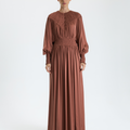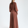 Tarçın tonu ve büzgü detaylı yaka tasarımıyla öne çıkan uzun elbise, güçlü bir stil sunar.