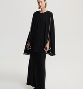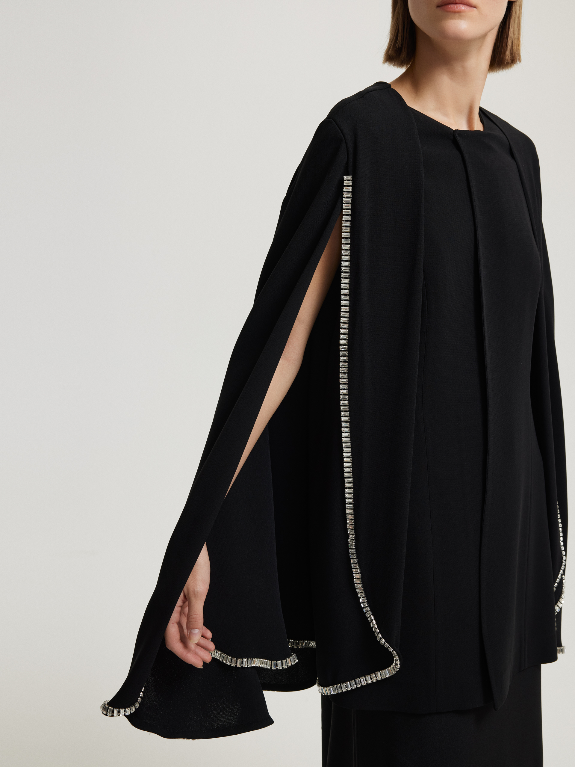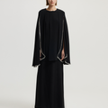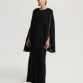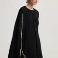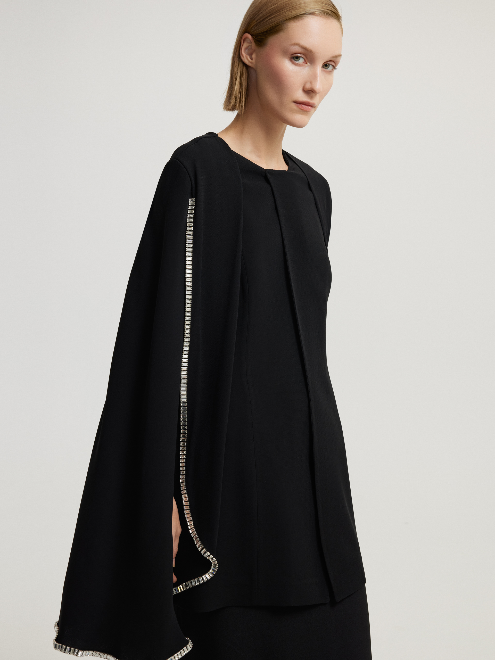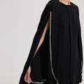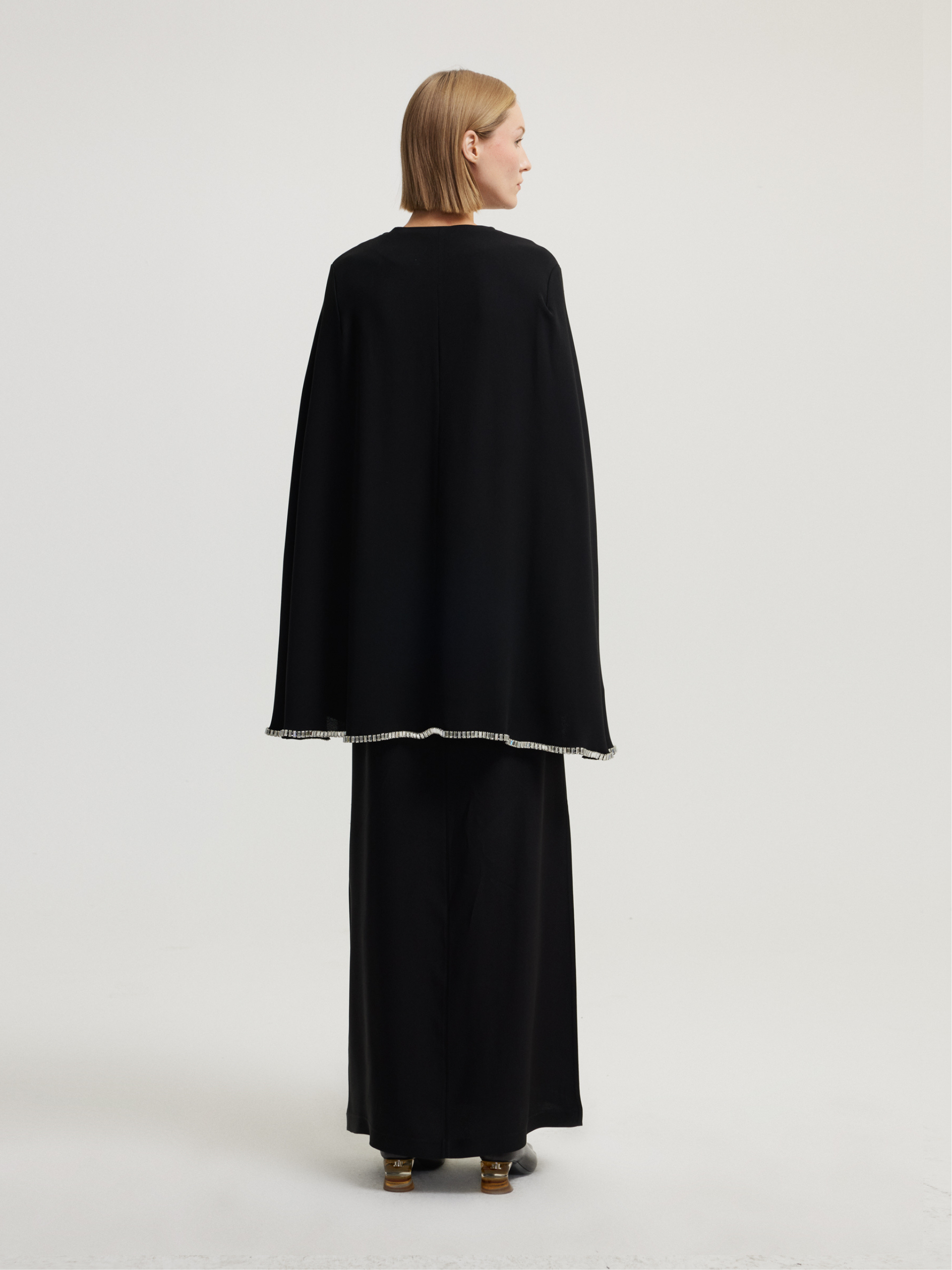 Siyah renk uzun ceketin yırtmaçlı kolunda taş işleme detayları yer alıyor. Bu ceketi siyah etek ya da pantolonla kombinleyebilirsiniz.