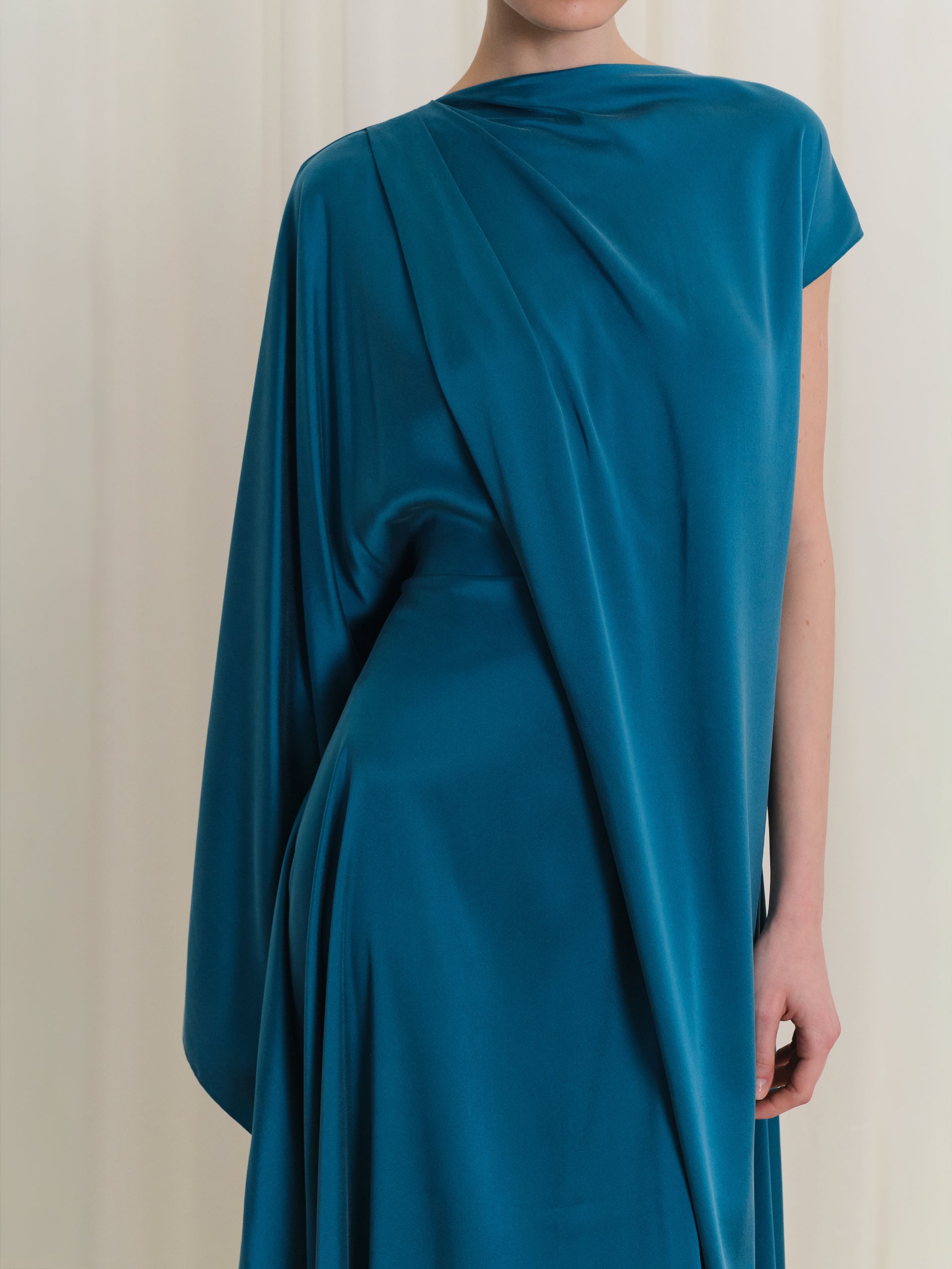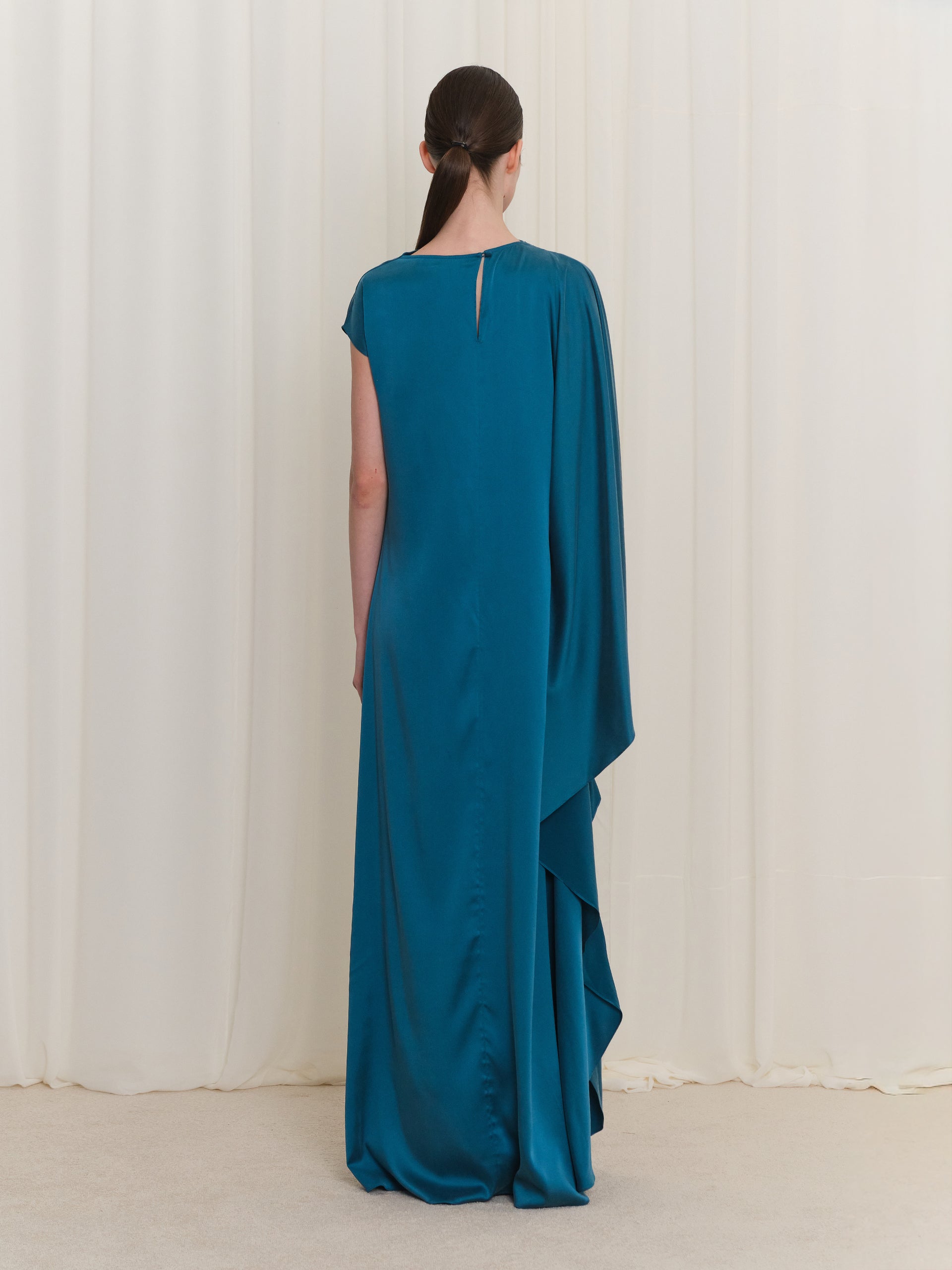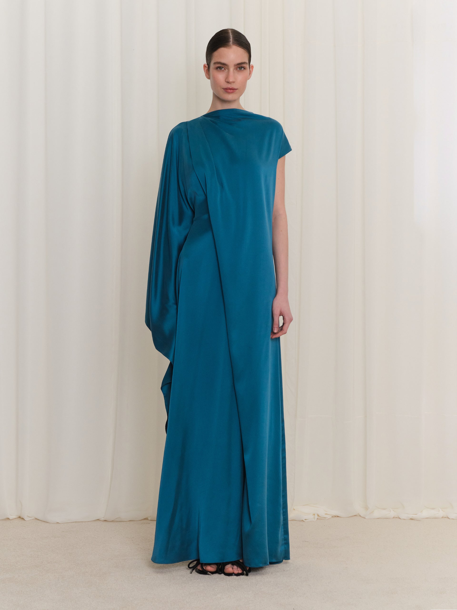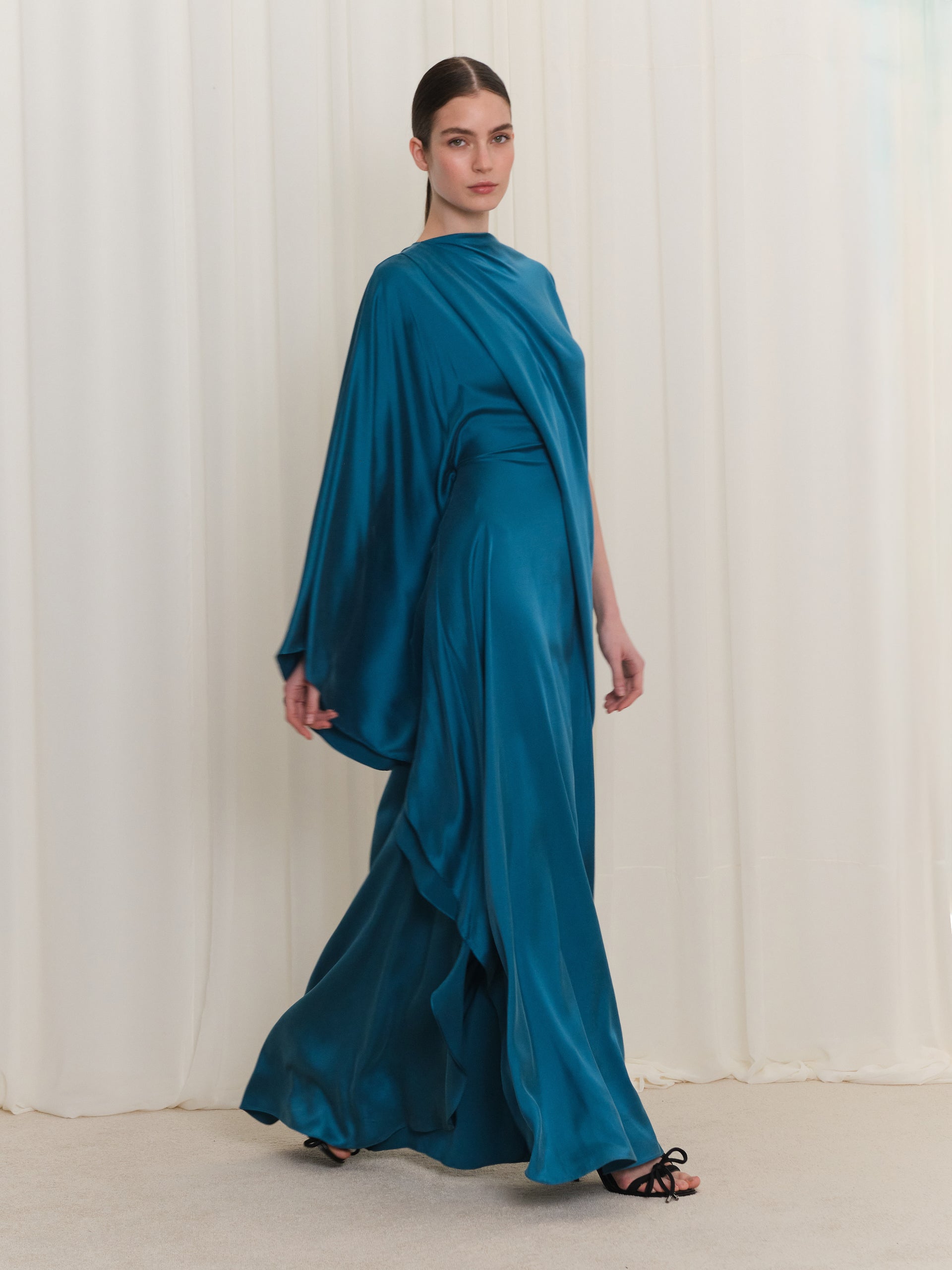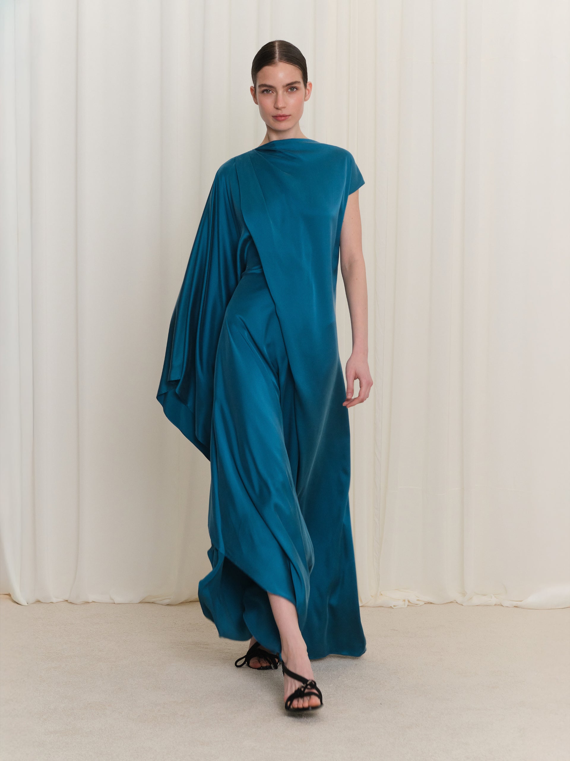 Omuz drapeleriyle hareket kazanan bu kadın elbise, ipek dokusunun doğal parlaklığıyla zarif ve sofistike bir siluet oluşturur. Yumuşak yüzeyi ve dökümlü yapısı sayesinde vücutta hafif ve rahat bir his bırakarak konforlu bir kullanım sunar. Zamansız tasarımı, özel davetler ve şık akşam organizasyonları için dengeli ve etkileyici bir seçenek haline gelir.