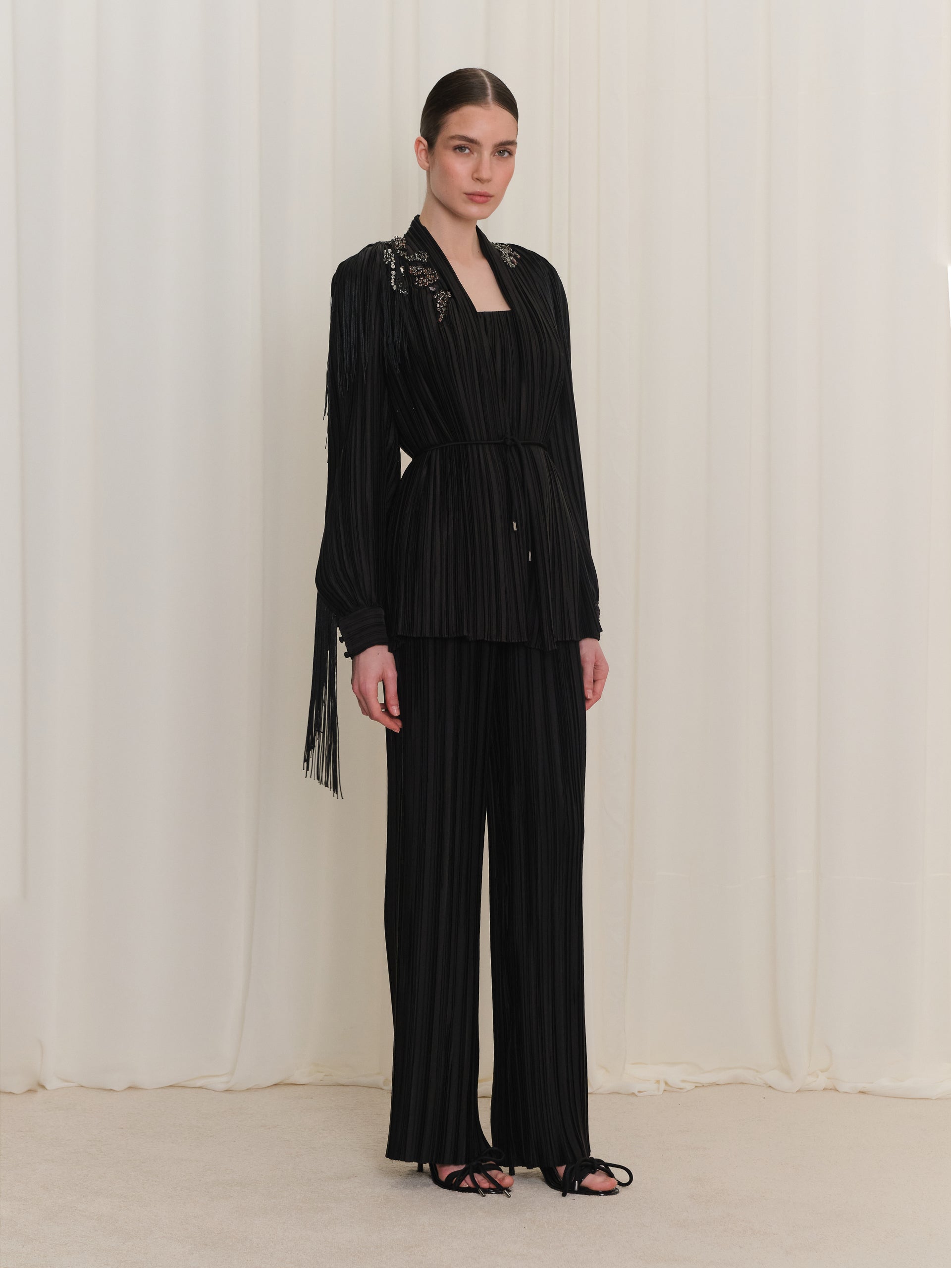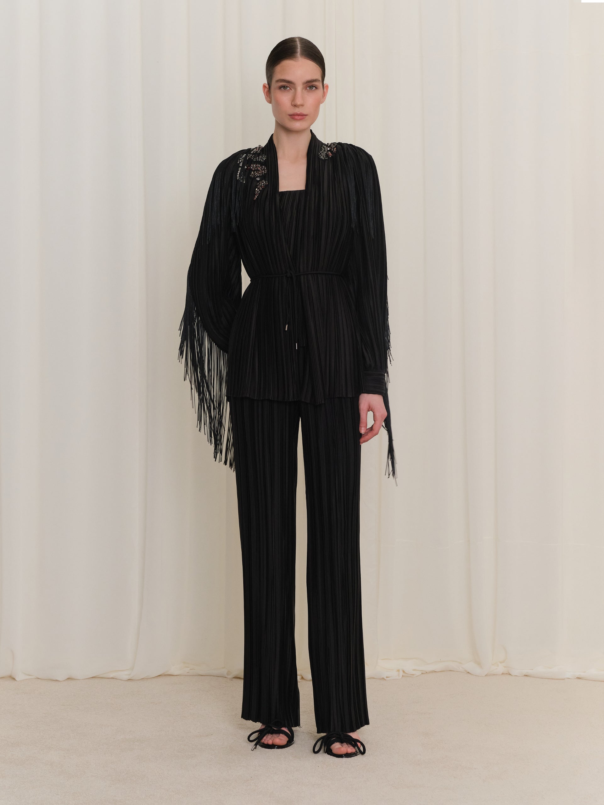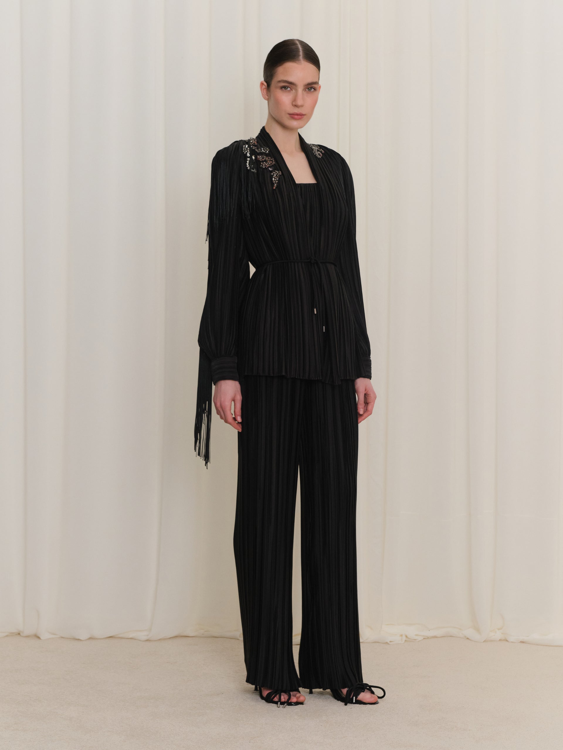 Pilise detayları ve zarif nakışlarıyla öne çıkan bu kadın ceket, yapısal formu sayesinde güçlü ve şık bir duruş sunar. Kumaşın akışkanlığı ve piliselerin hareketi, gün boyu konforlu ve dengeli bir kullanım hissi yaratır. Klasik çizgilerle modern dokunuşları bir araya getiren tasarımı, hem günlük stil hem de özel davetler için zamansız bir dış giyim alternatifi oluşturur.