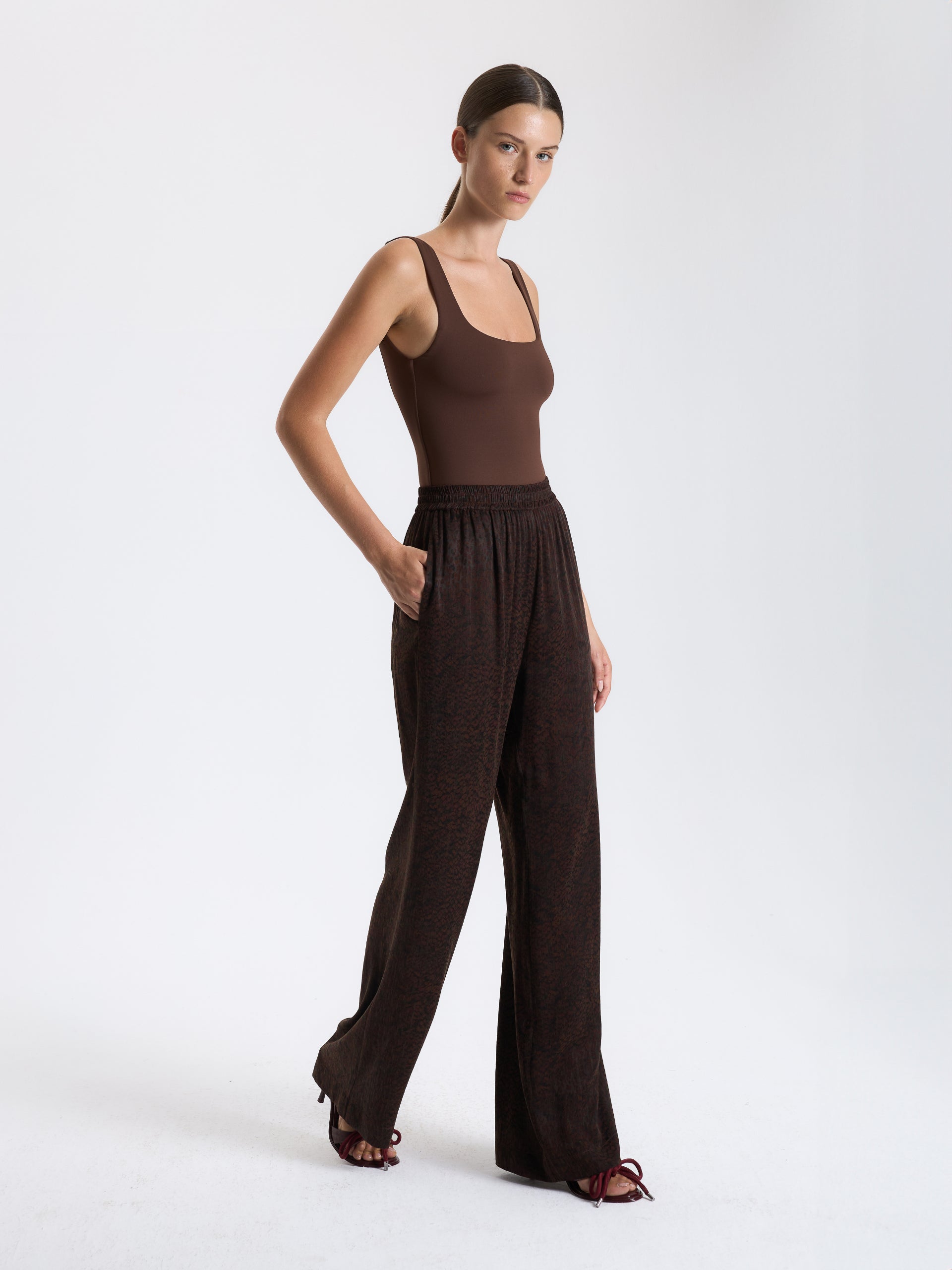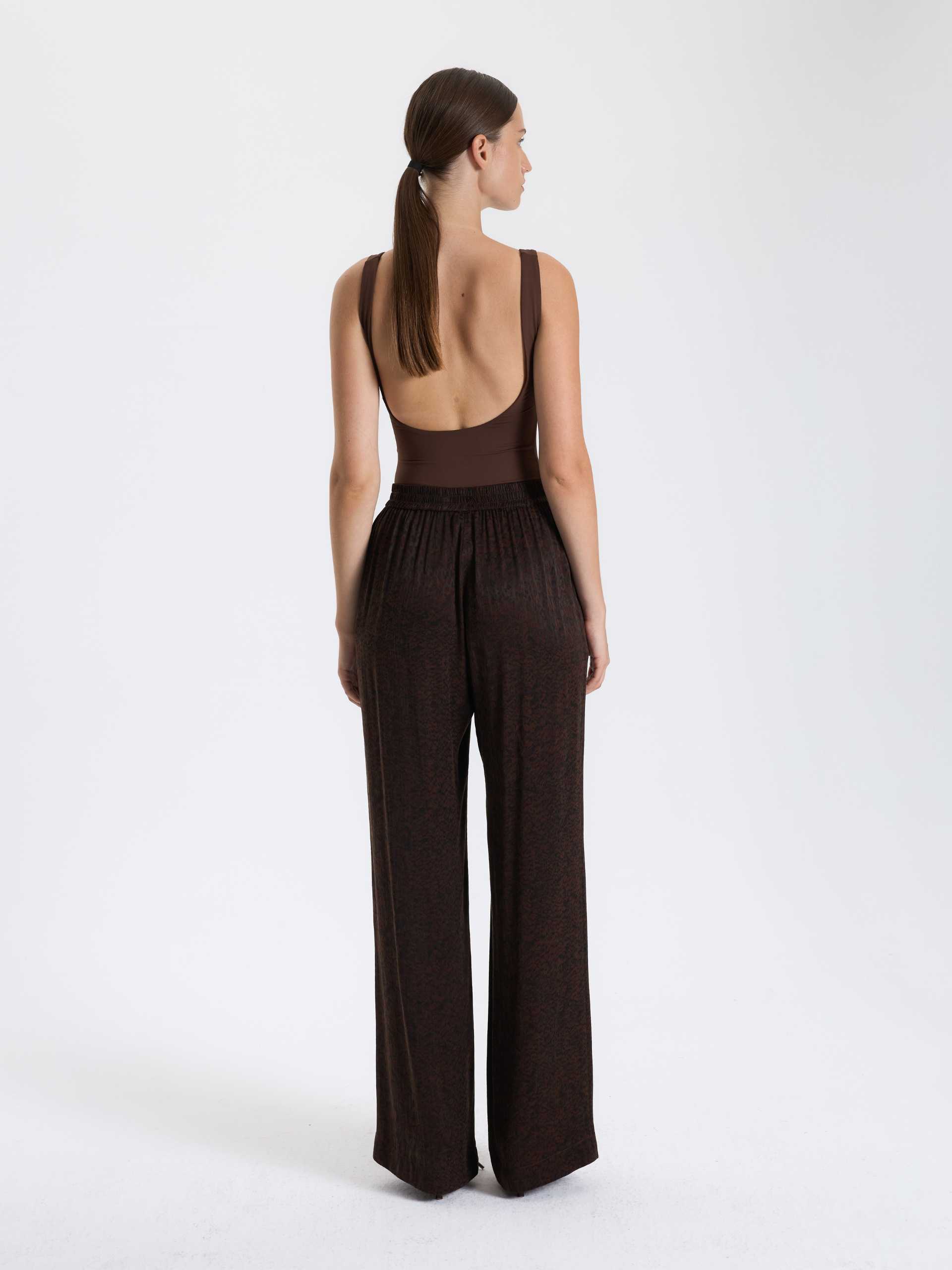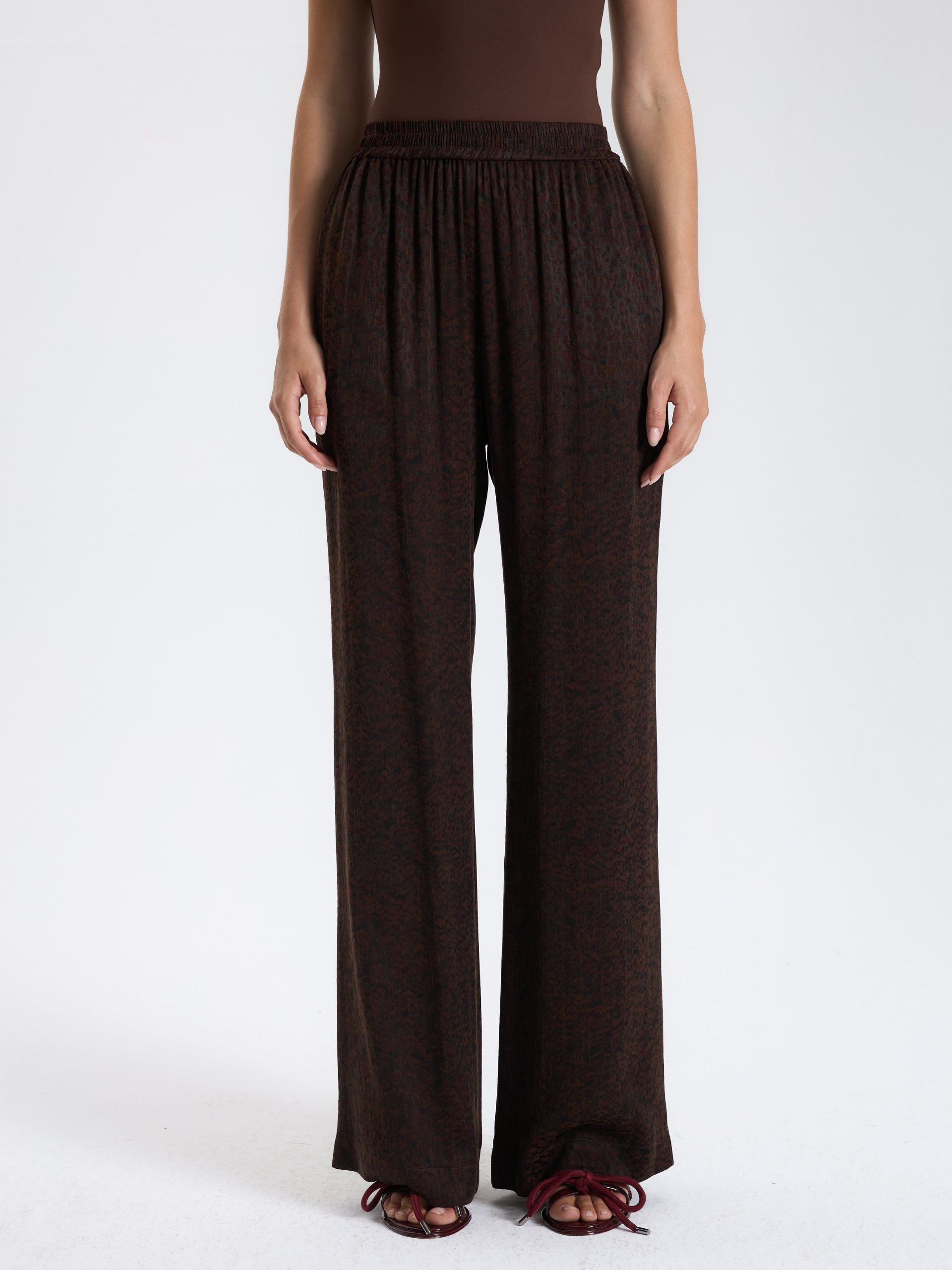 Desenli kumaşıyla dikkat çeken bordo palazzo pantolon, rahat kesimiyle günlük şıklık için sofistike bir seçenek.