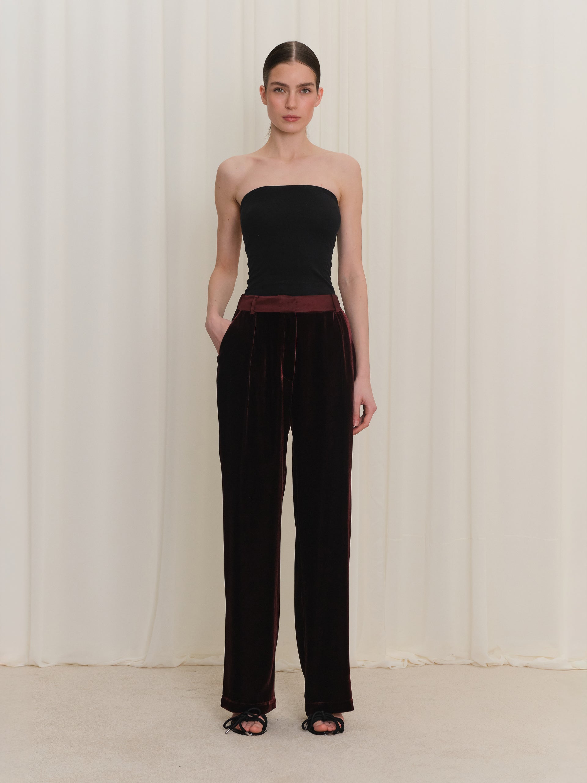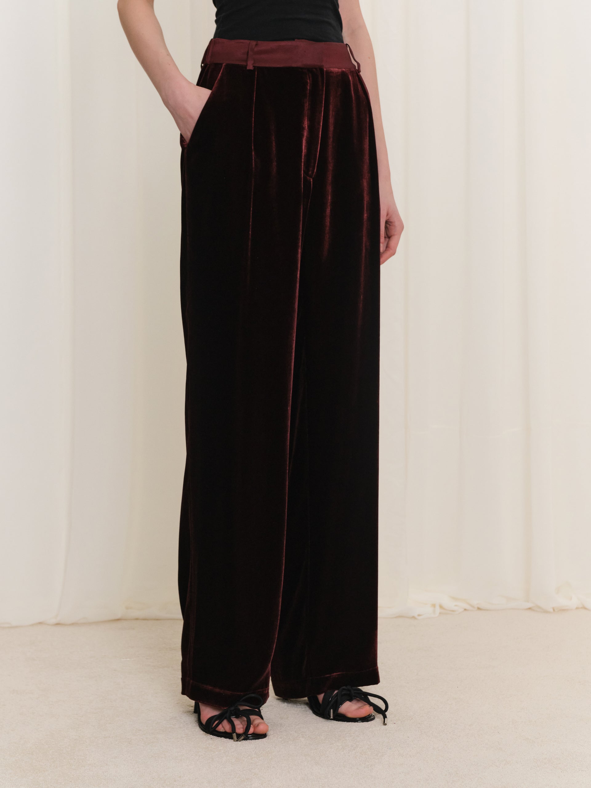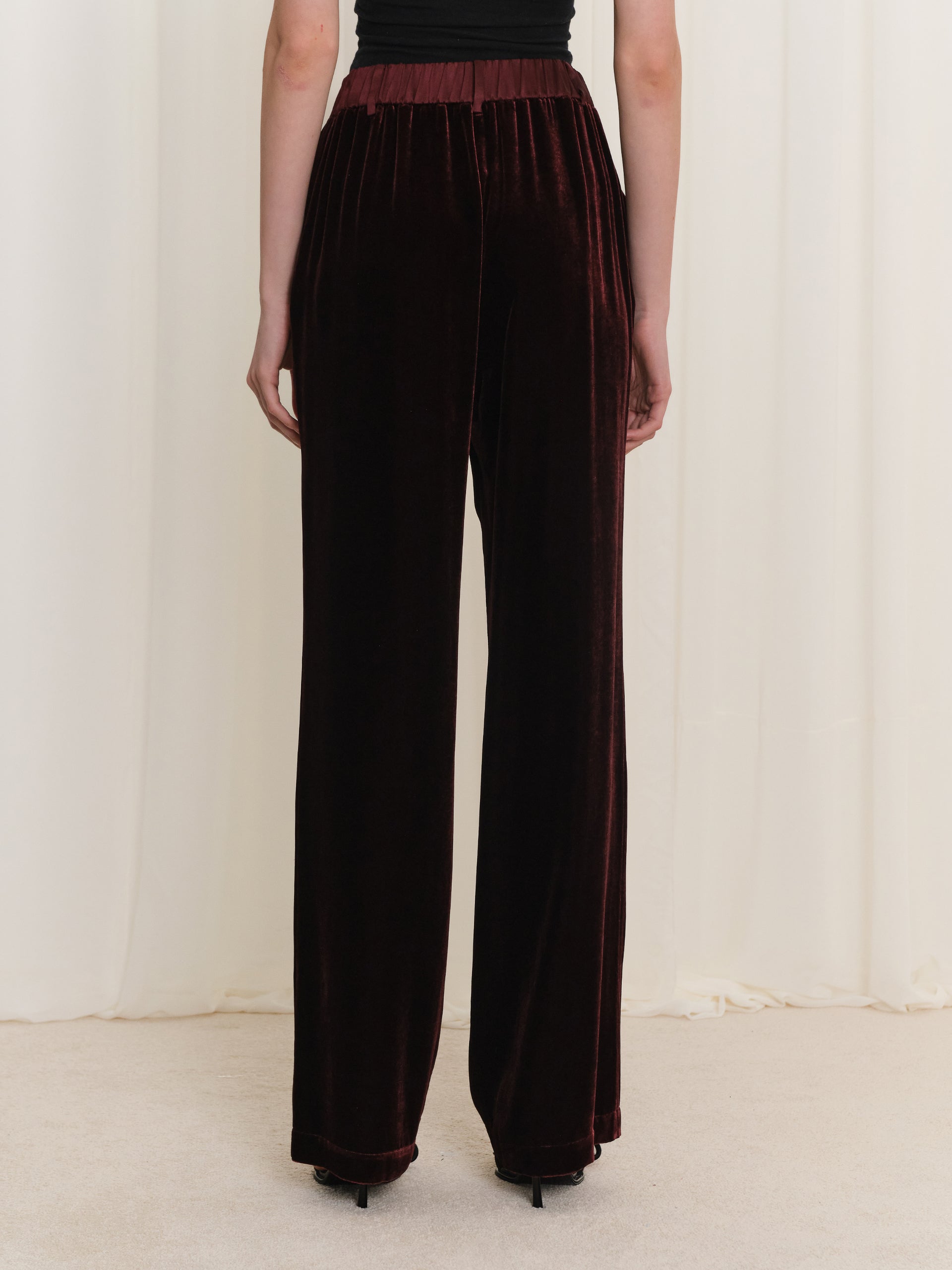 Bordo kadife kumaşıyla öne çıkan bu kadın pantolon, yumuşak dokusu ve doğal parlaklığıyla şık bir duruş sunar. Akışkan formu sayesinde vücutta rahat bir oturuş sağlarken gün boyu konforlu bir kullanım hissi verir. Zamansız tasarımı, hem günlük stil hem de özel anlarda güçlü ve sofistike bir görünüm oluşturur.