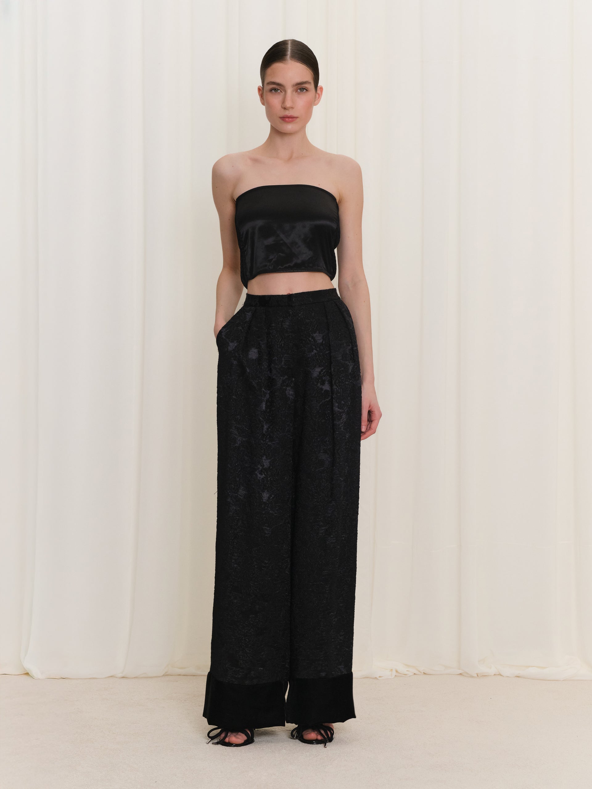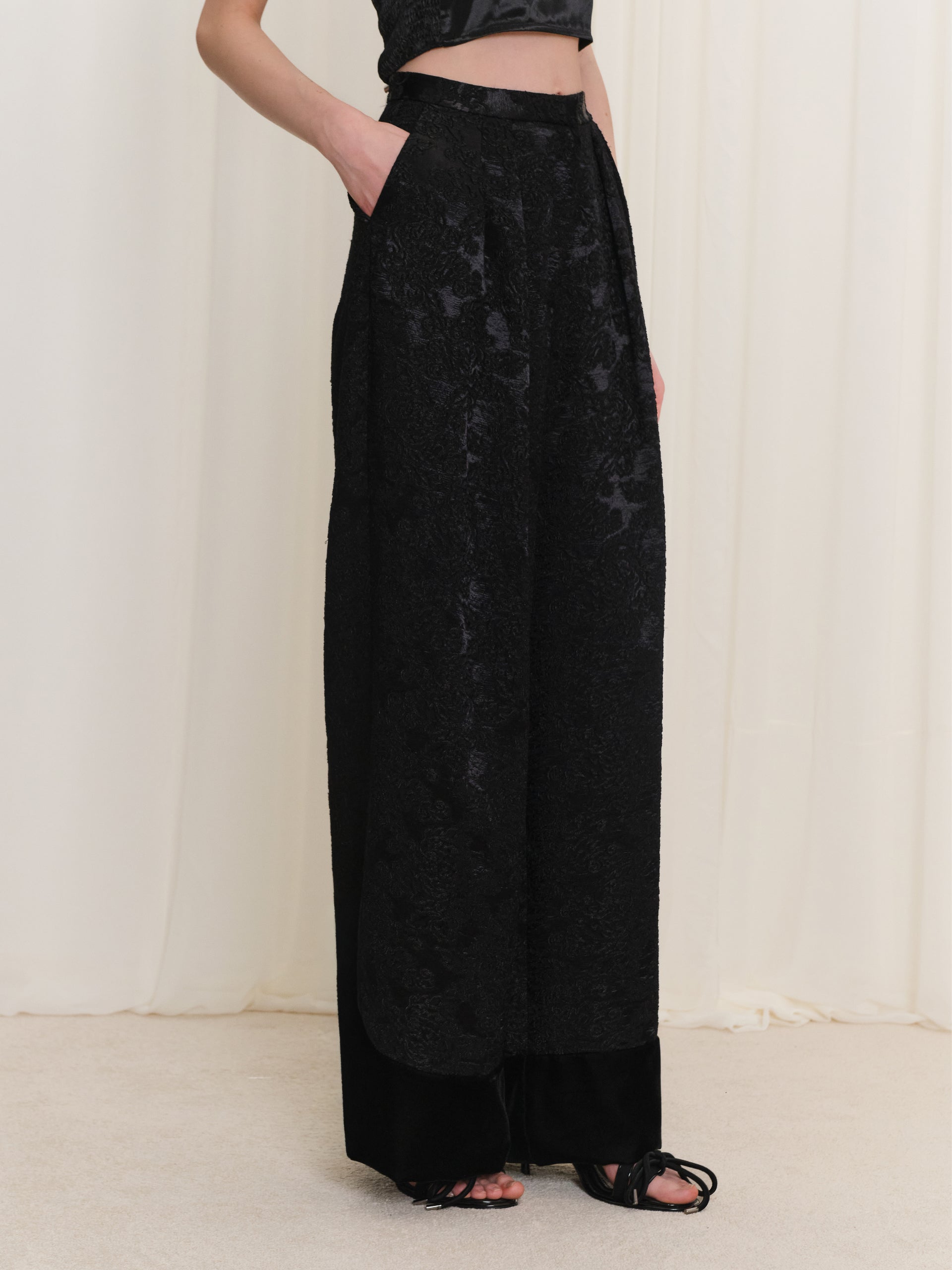 Jakar desenli pantolon, dokulu kumaşı ve şık siluetiyle kadın pantolon kategorisinde güçlü bir stil sunar. Yüksek bel ve bol paça pantolon formu sayesinde hem dengeli bir görünüm sağlar hem de konforlu bir kullanım deneyimi sunar. Siyah pantolon alternatifi olarak öne çıkan bu tasarım, modern çizgileriyle akşam stili için zarif bir seçimdir.