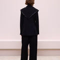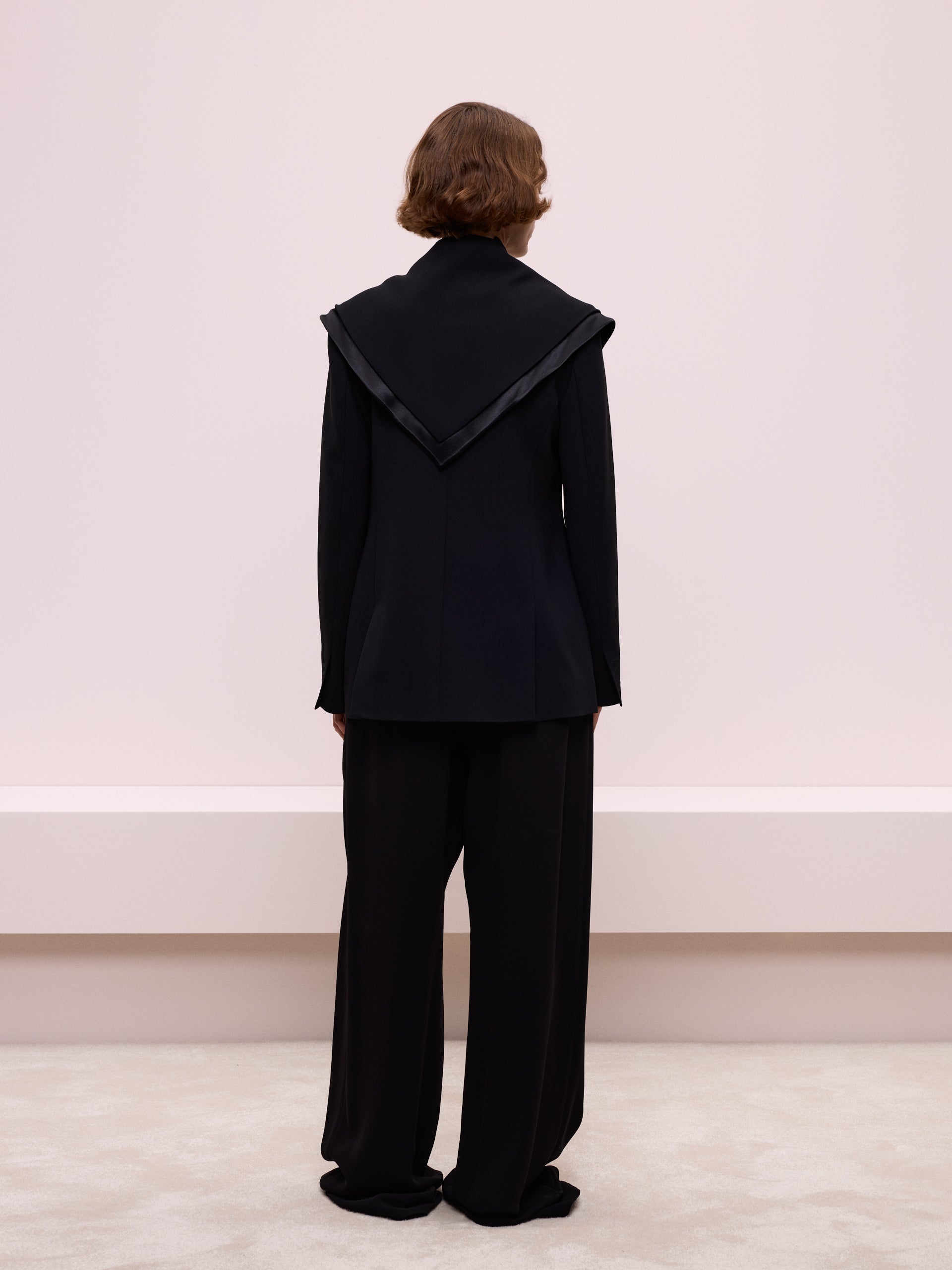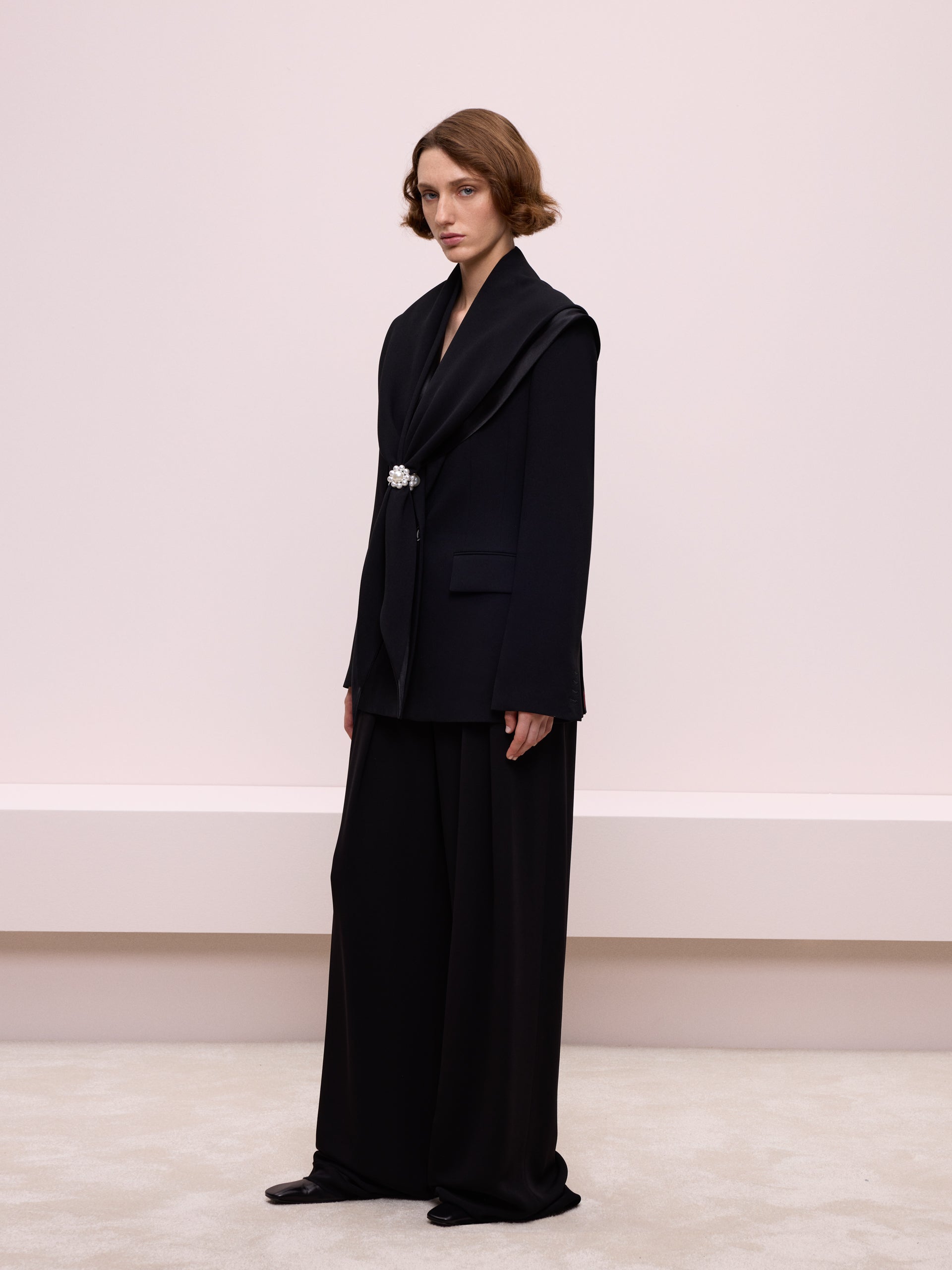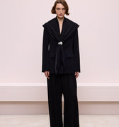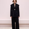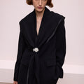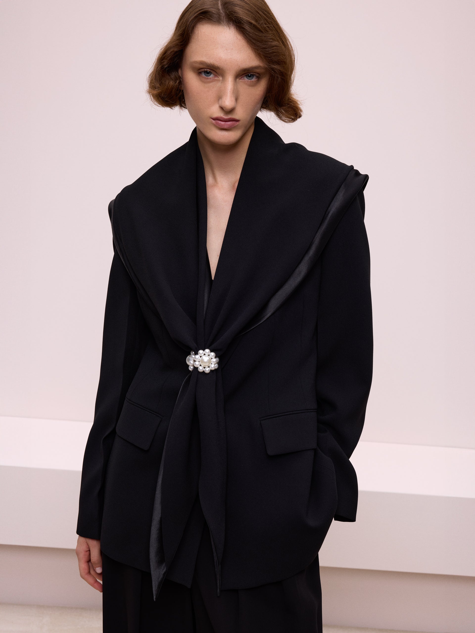 Omzuna yerleştirilmiş olan şal detayıyla dikkat çeken bu ceketin önünde toka bağlama yer alıyor.