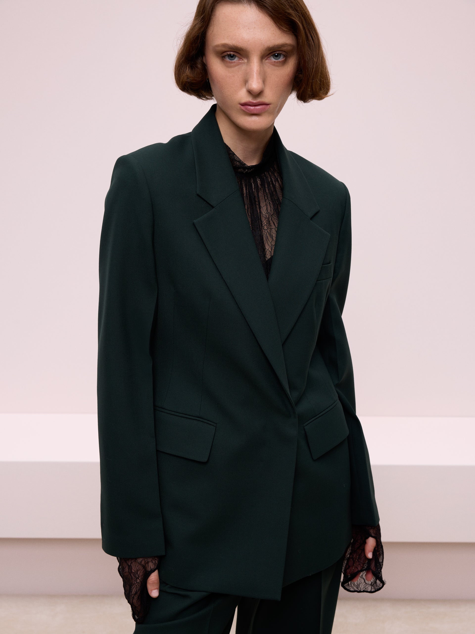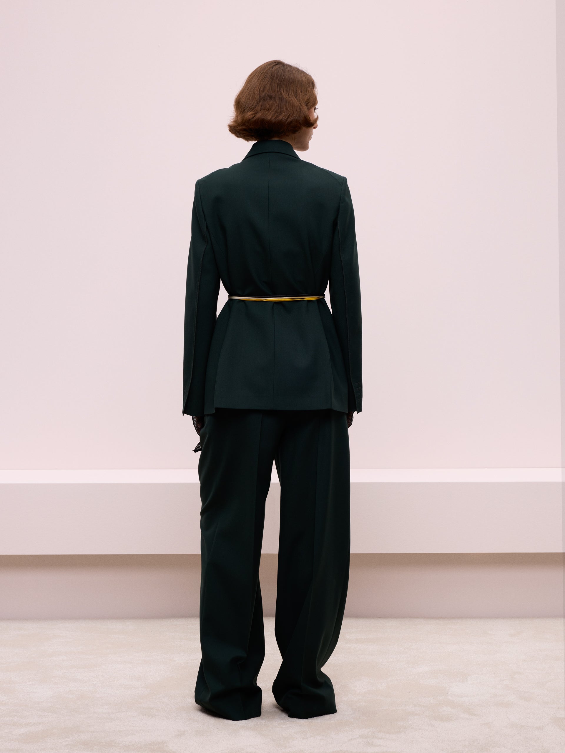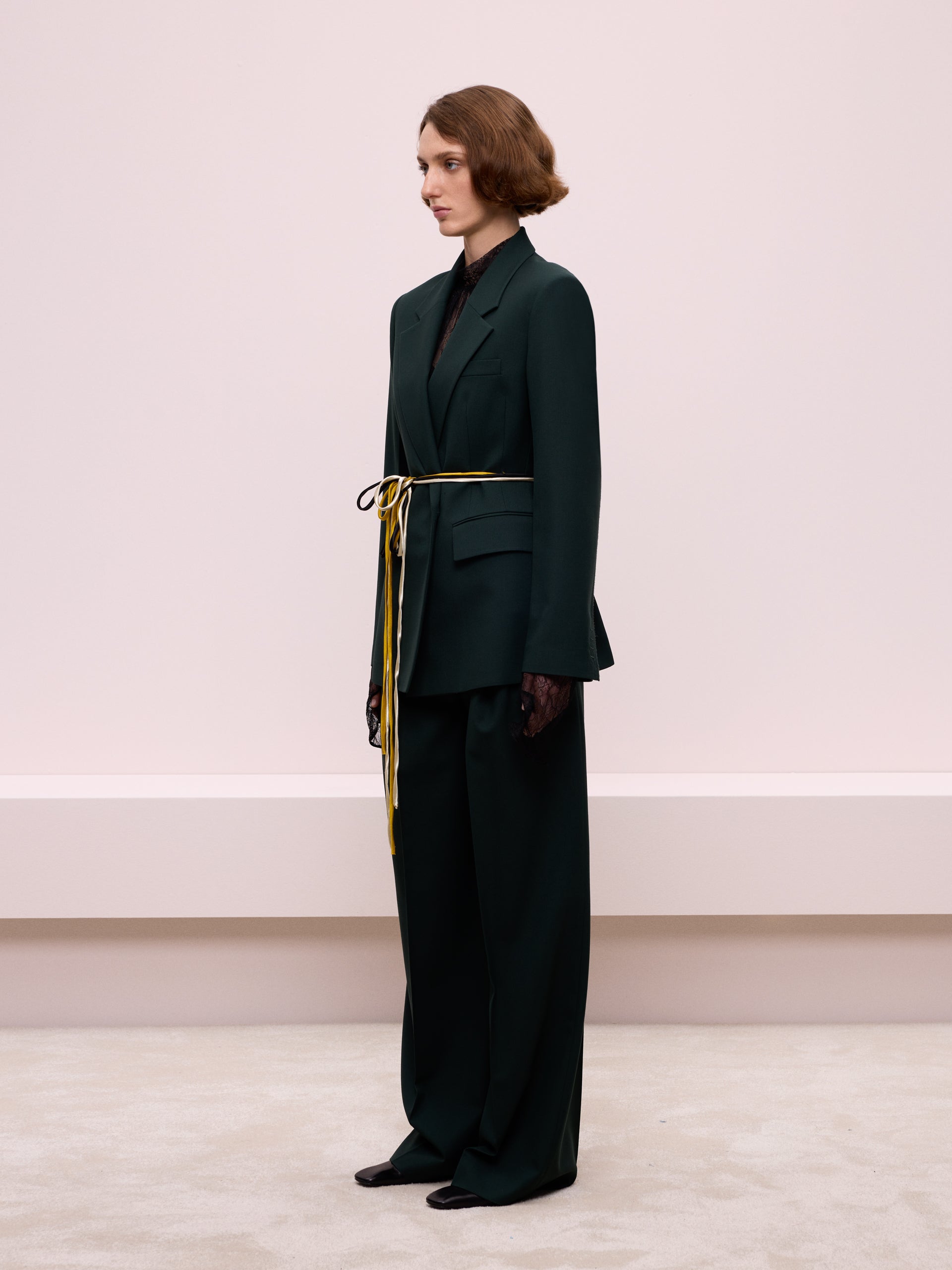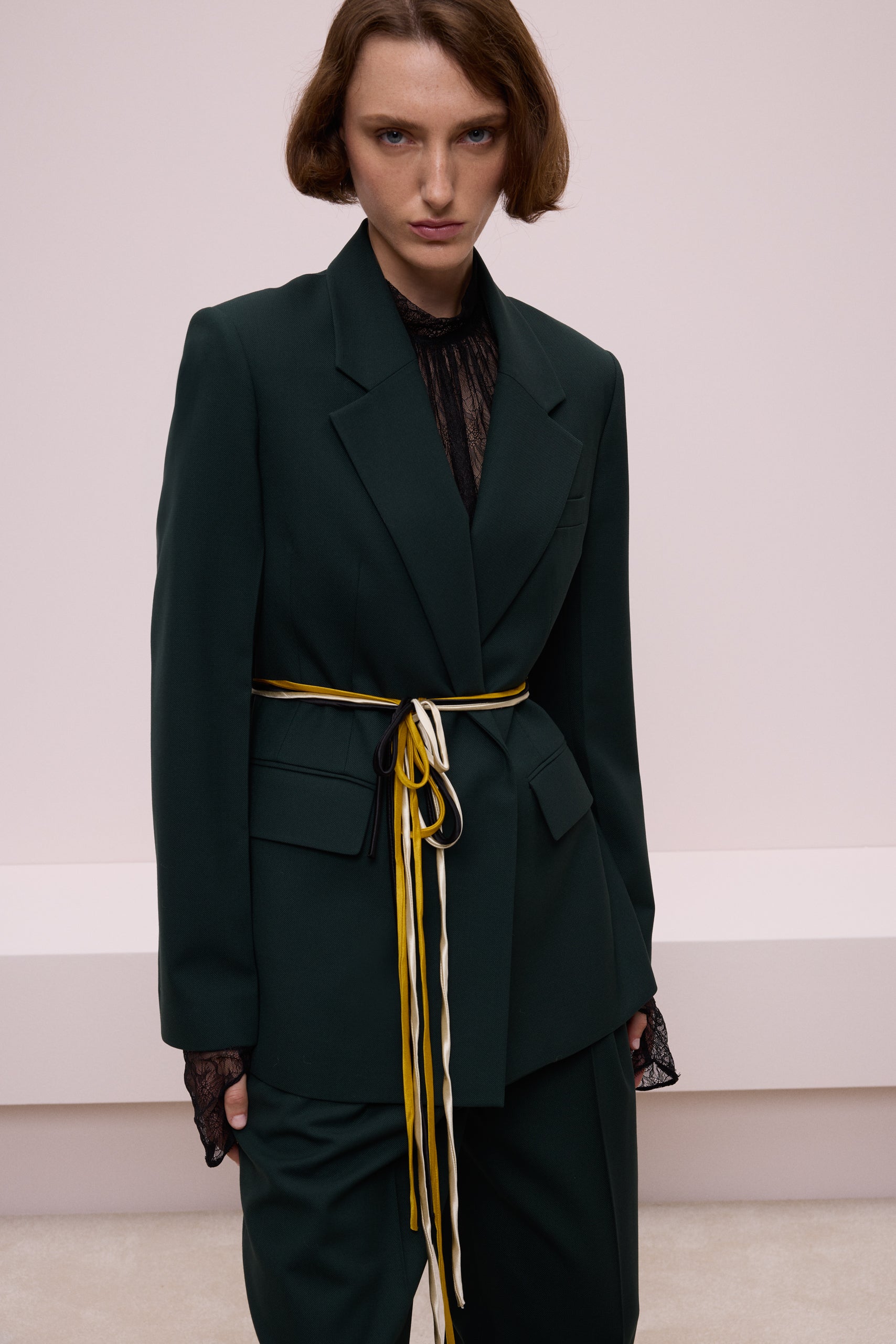 Yeşil renk ceketi, ofis görünümlerinizin bir parçası haline getirebilirsiniz. Bu ceketin belinde, renkli kuşak yer alıyor.