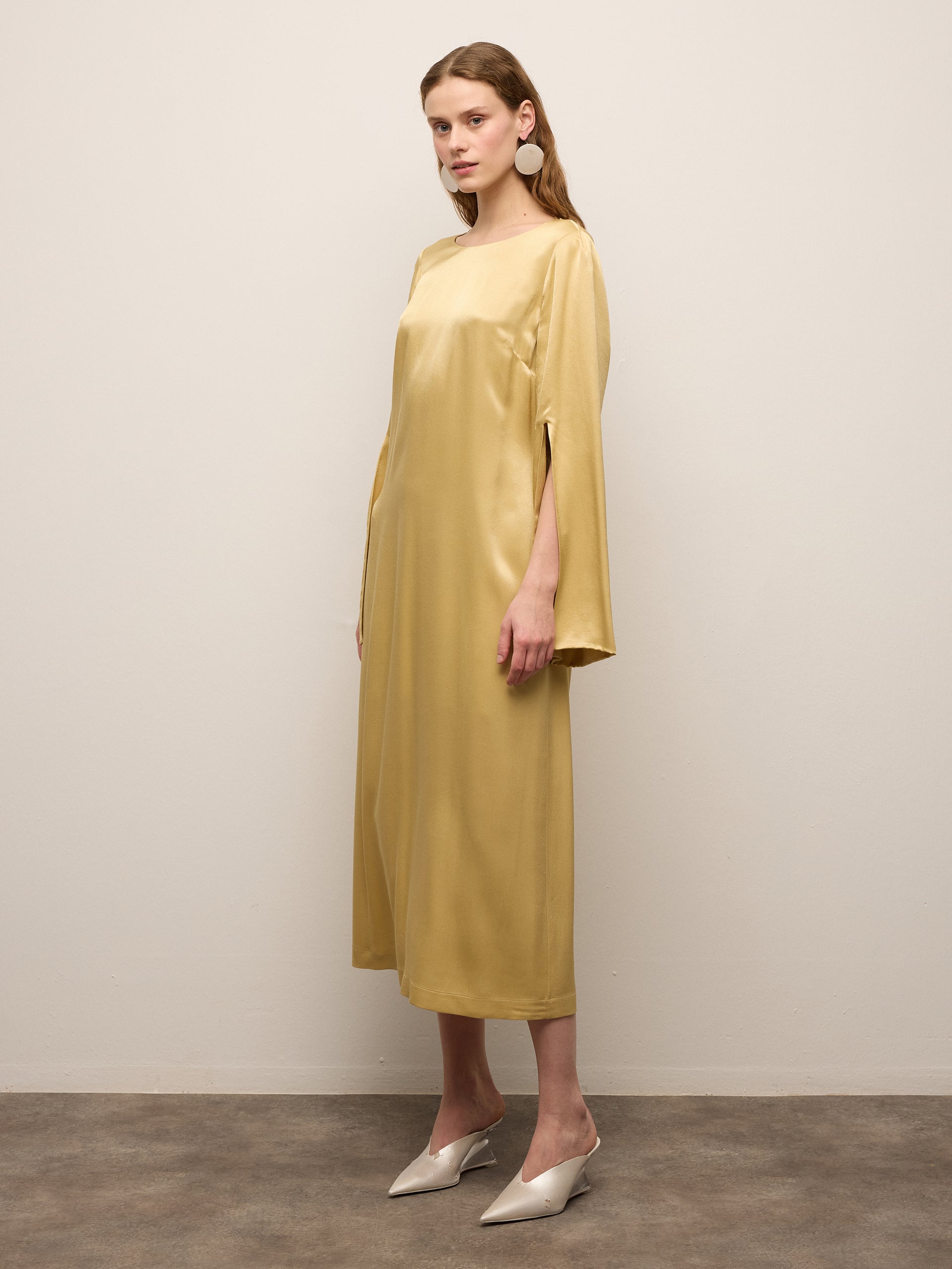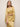 The mustard-colored dress features a V-neck backless design with slits on the sleeves. The crisscross lacing at the back takes the dress beyond a classic style.