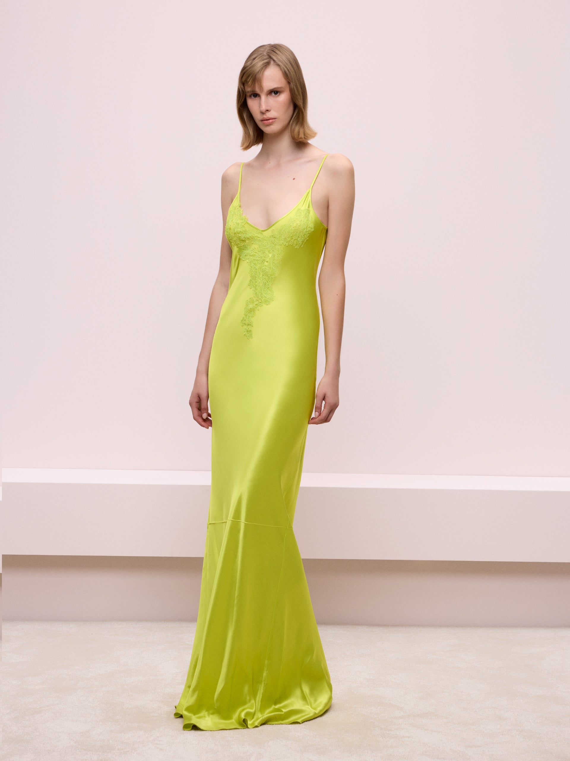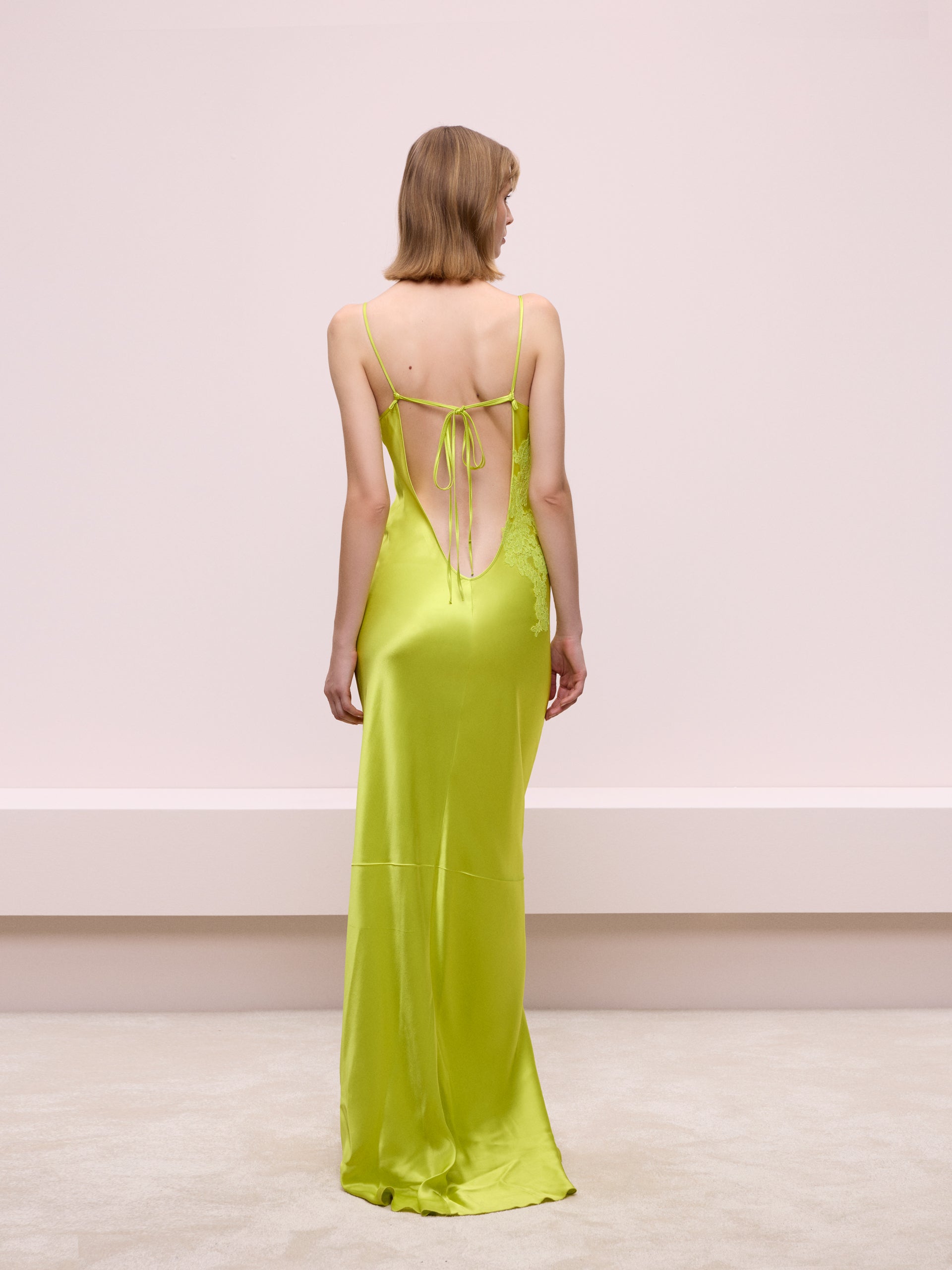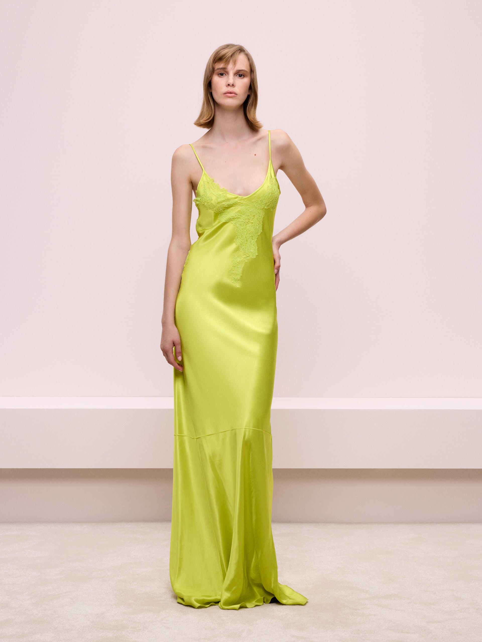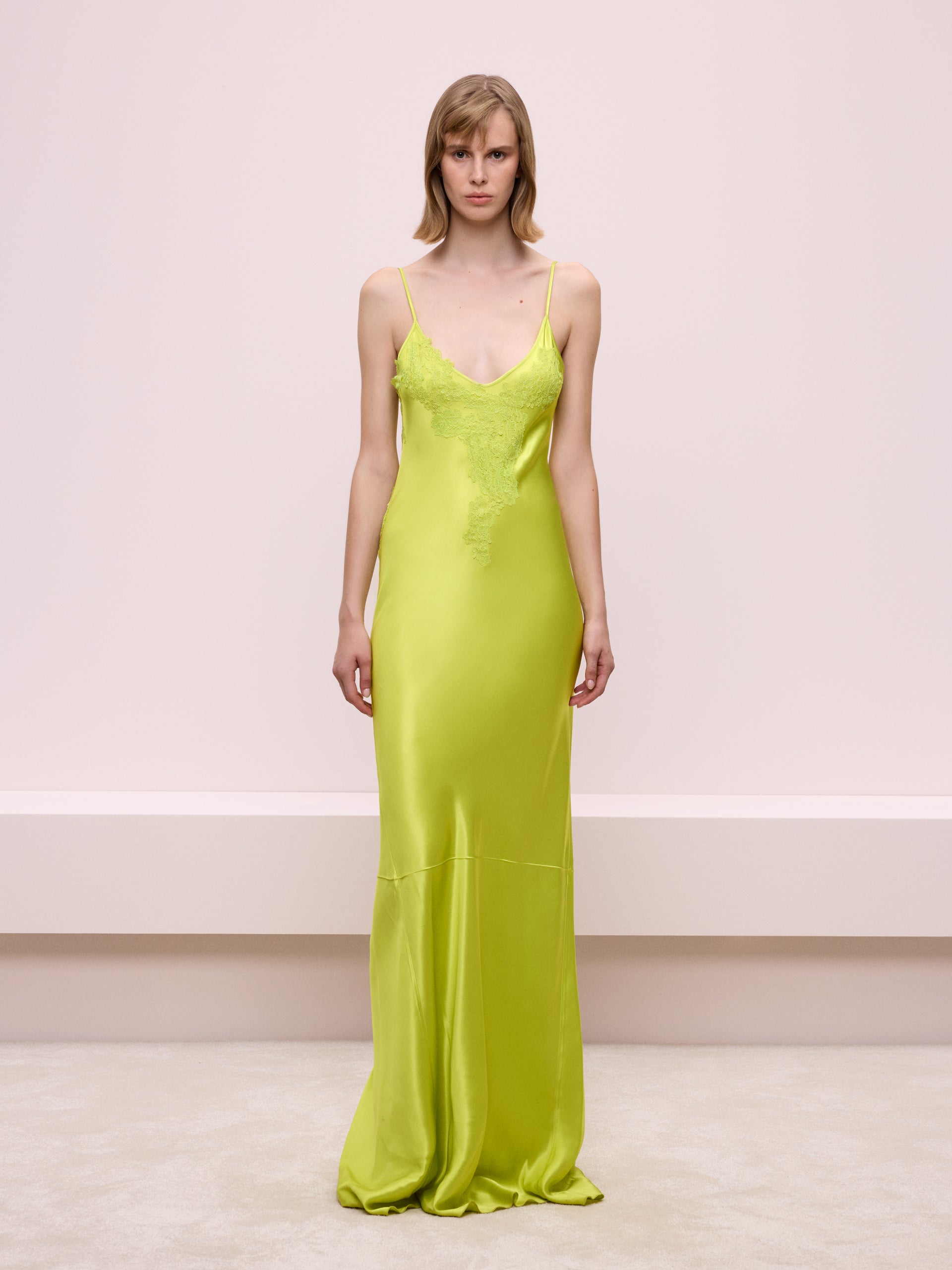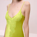 Limon rengi dantel detaylı elbise, zarif ve canlı tasarımıyla romantik ve enerjik tarzınızla göz kamaştırmak için ideal bir seçimdir.