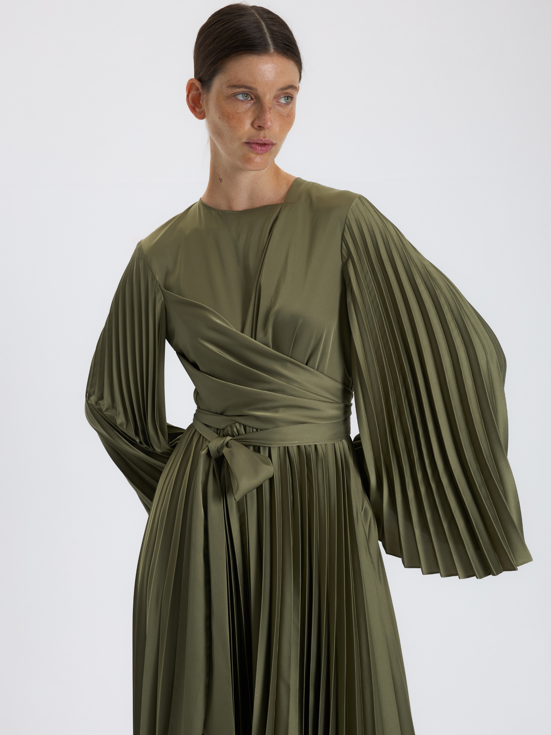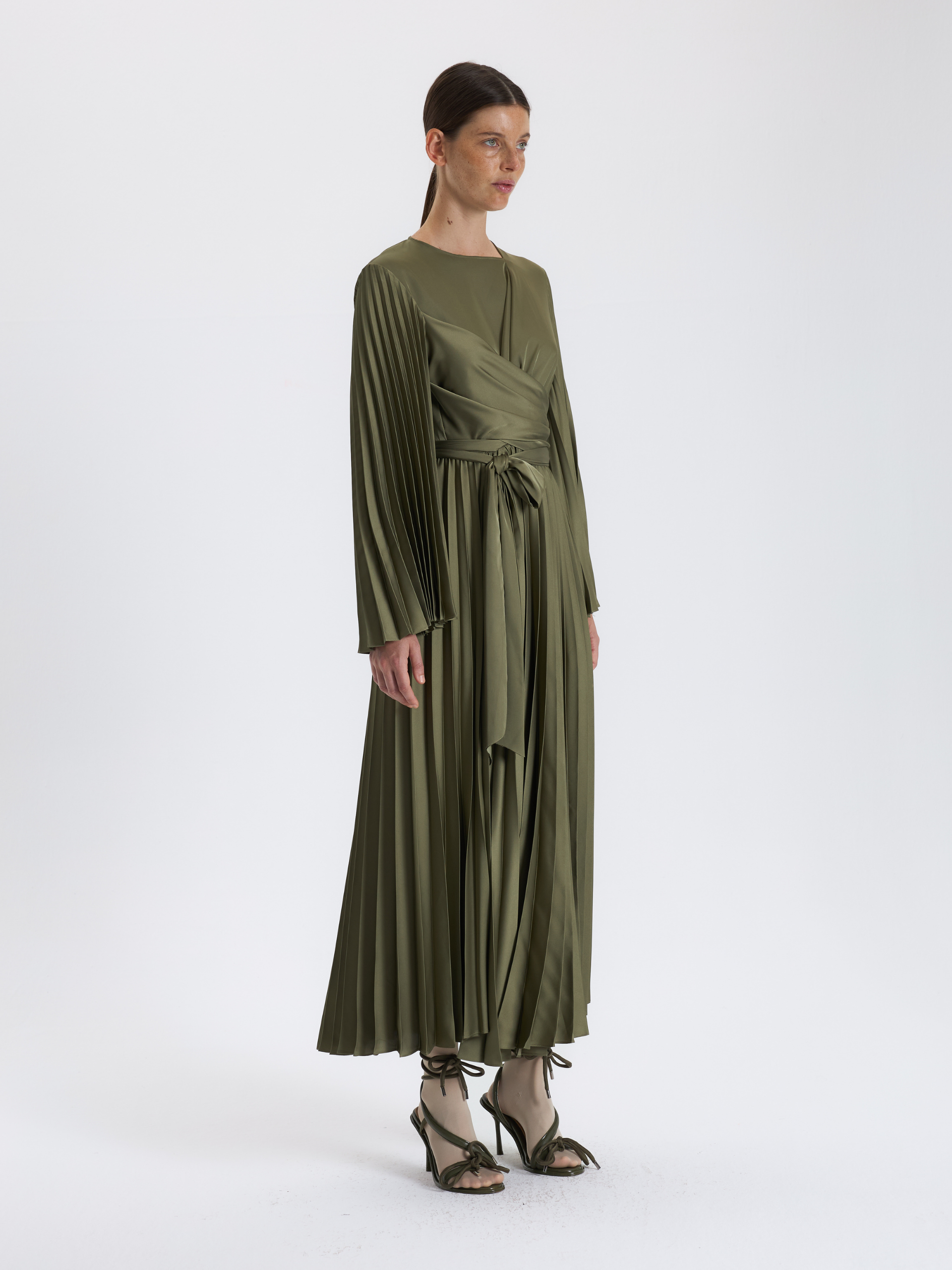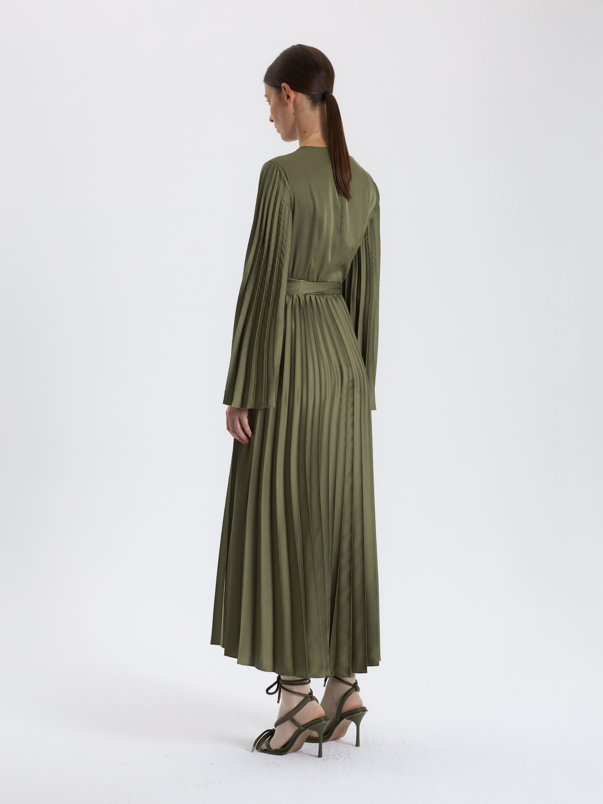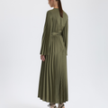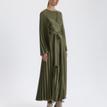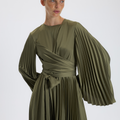 Haki Pileli Kuşaklı Elbise