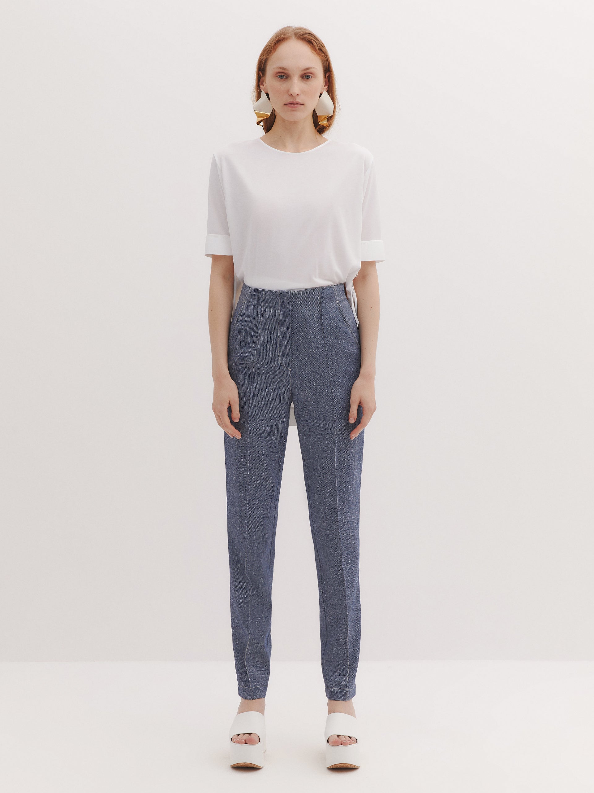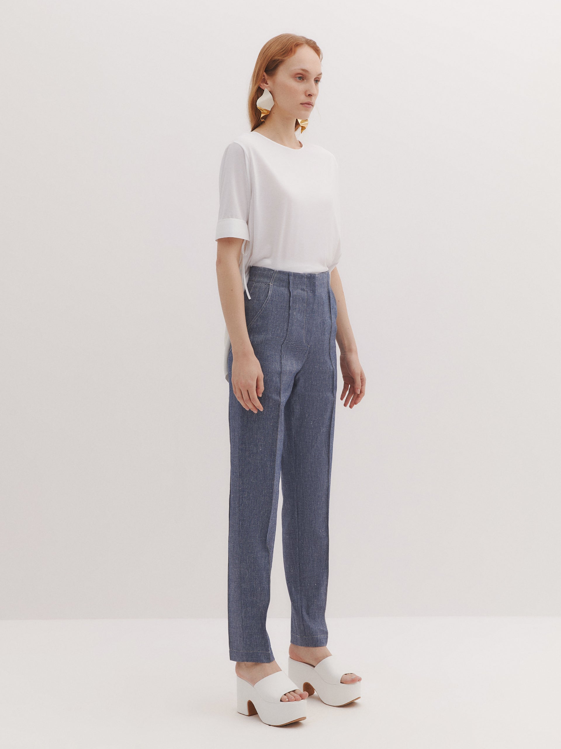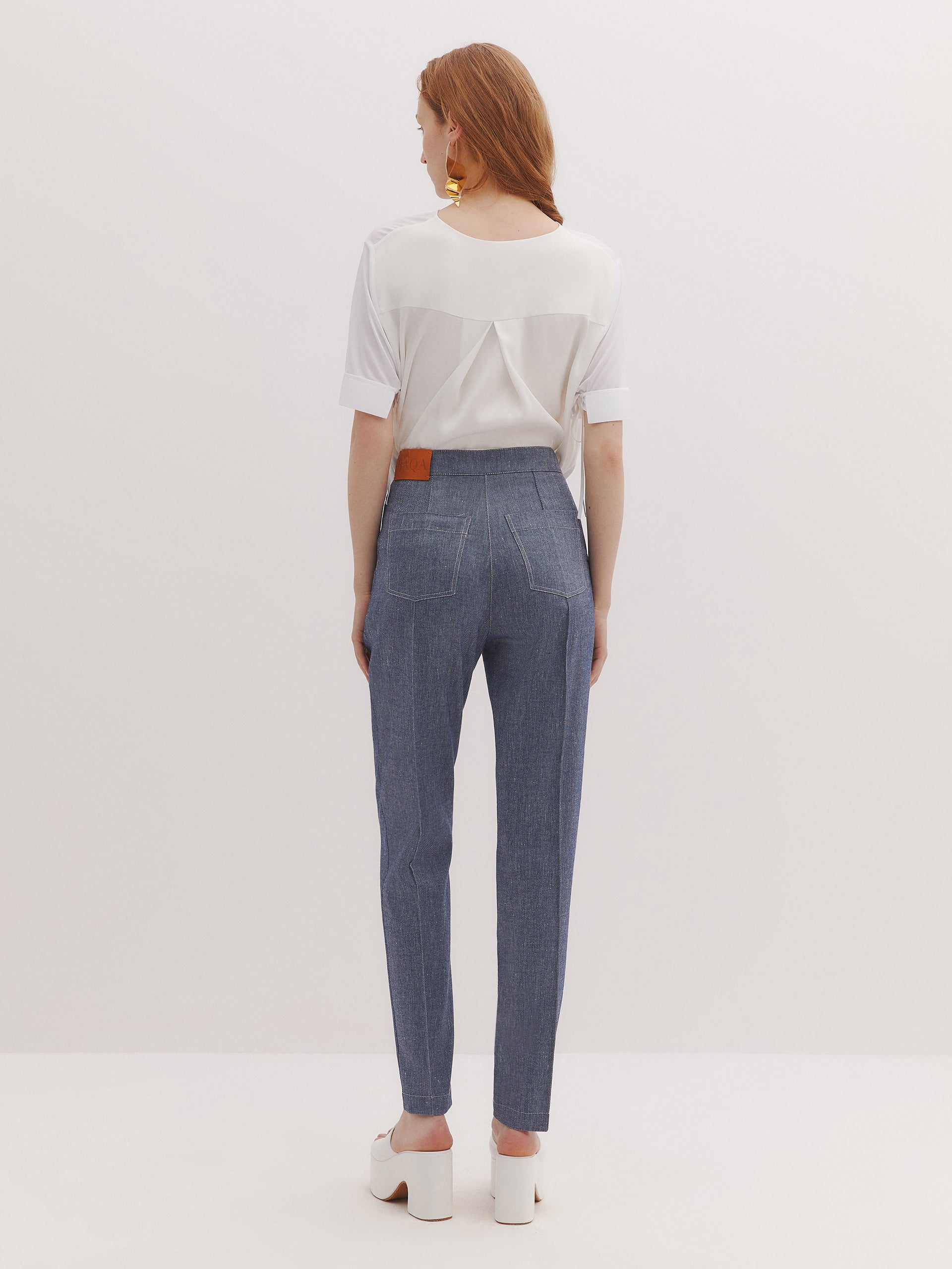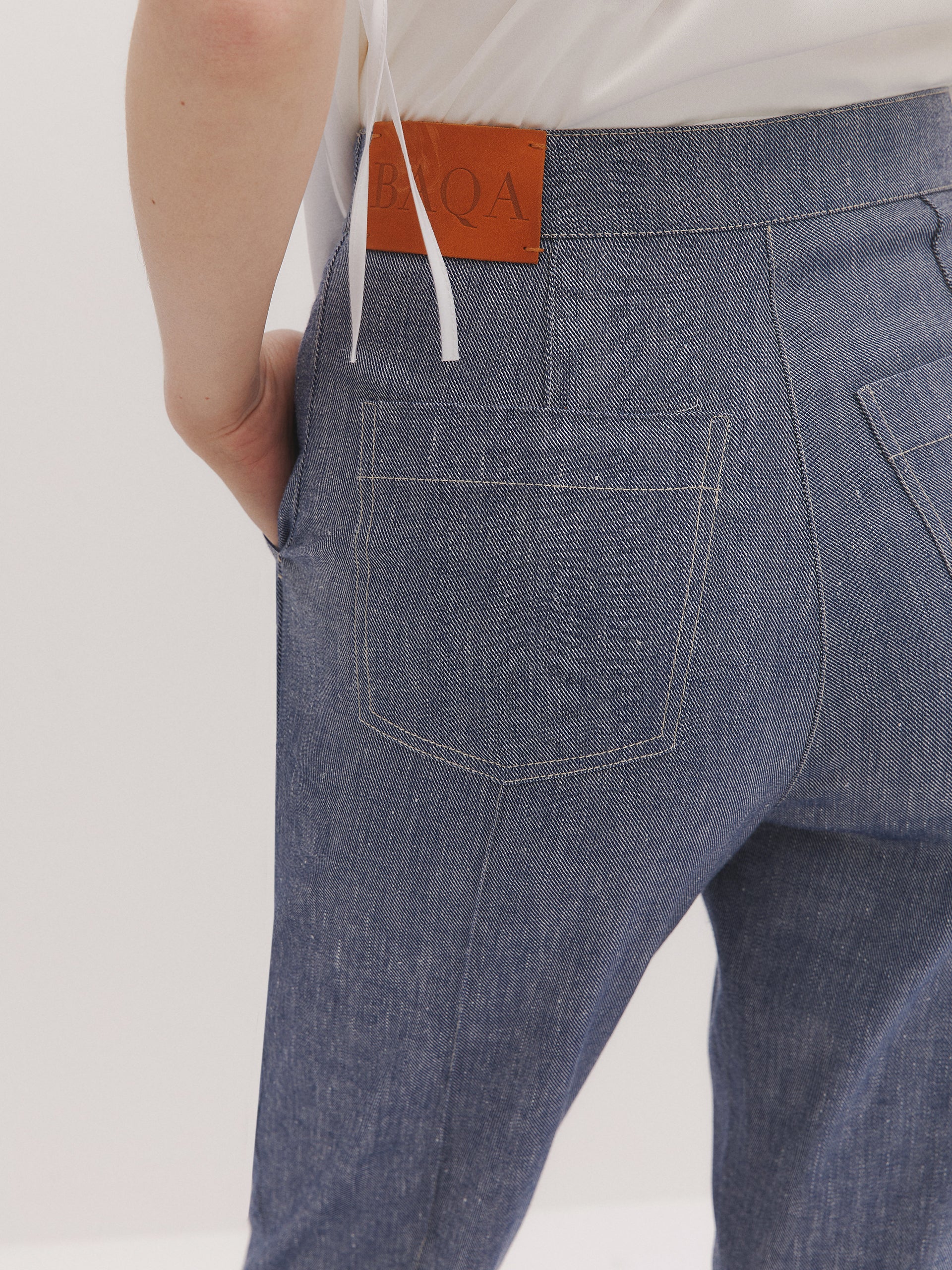 Vücuda yakın silüette tasarlanan kemersiz denim pantolonun üzerinde yer alan kontrast süs dikişleri, tasarıma modern ve dikkat çekici bir görünüm kazandırıyor. Slim fit kot pantolon formuyla öne çıkan bu kadın kot pantolon, zamansız yapısı sayesinde modern kot pantolon ve şık kadın pantolon kombinlerinde günlük şehir stiline rahatlıkla uyum sağlıyor.